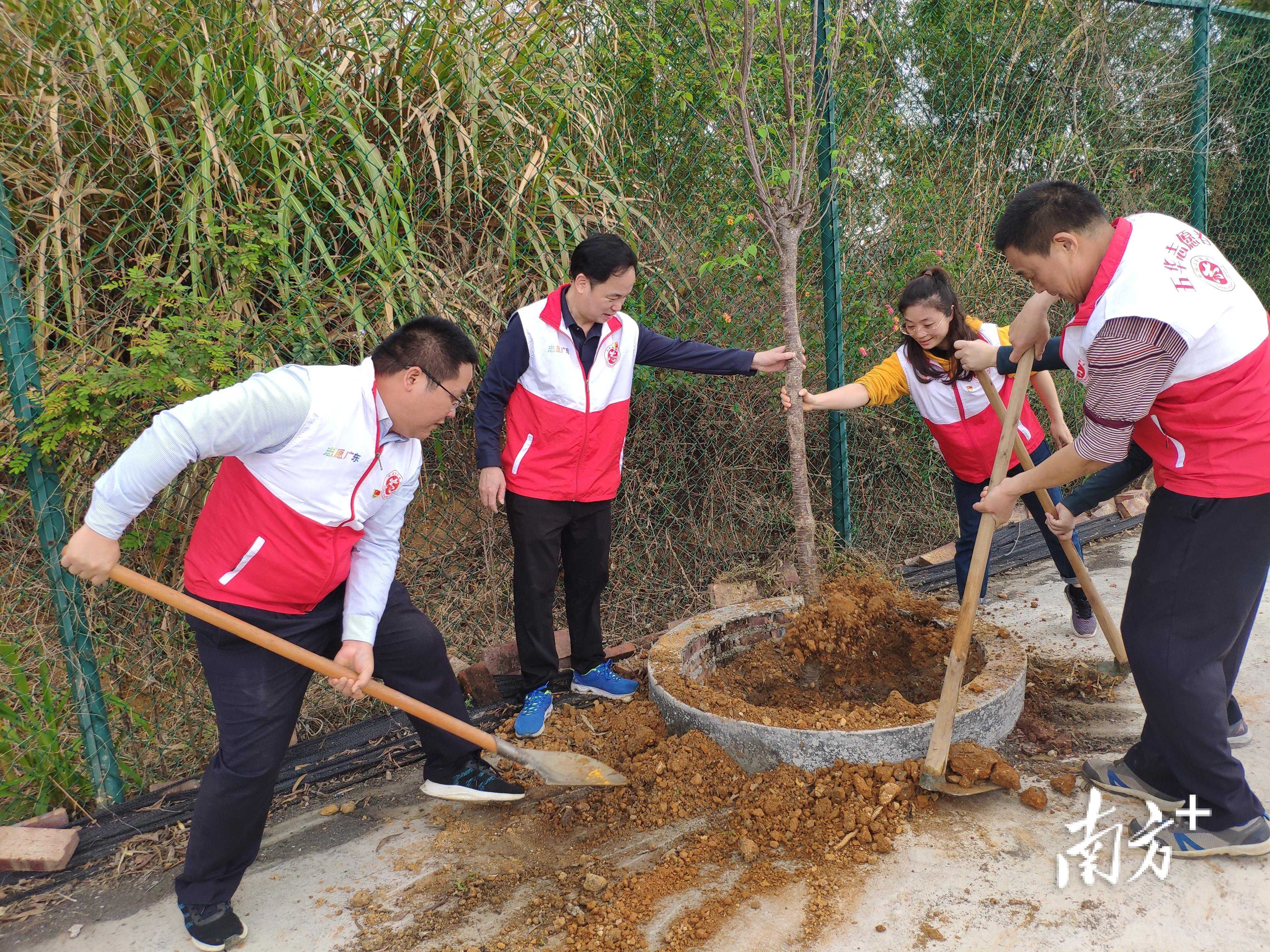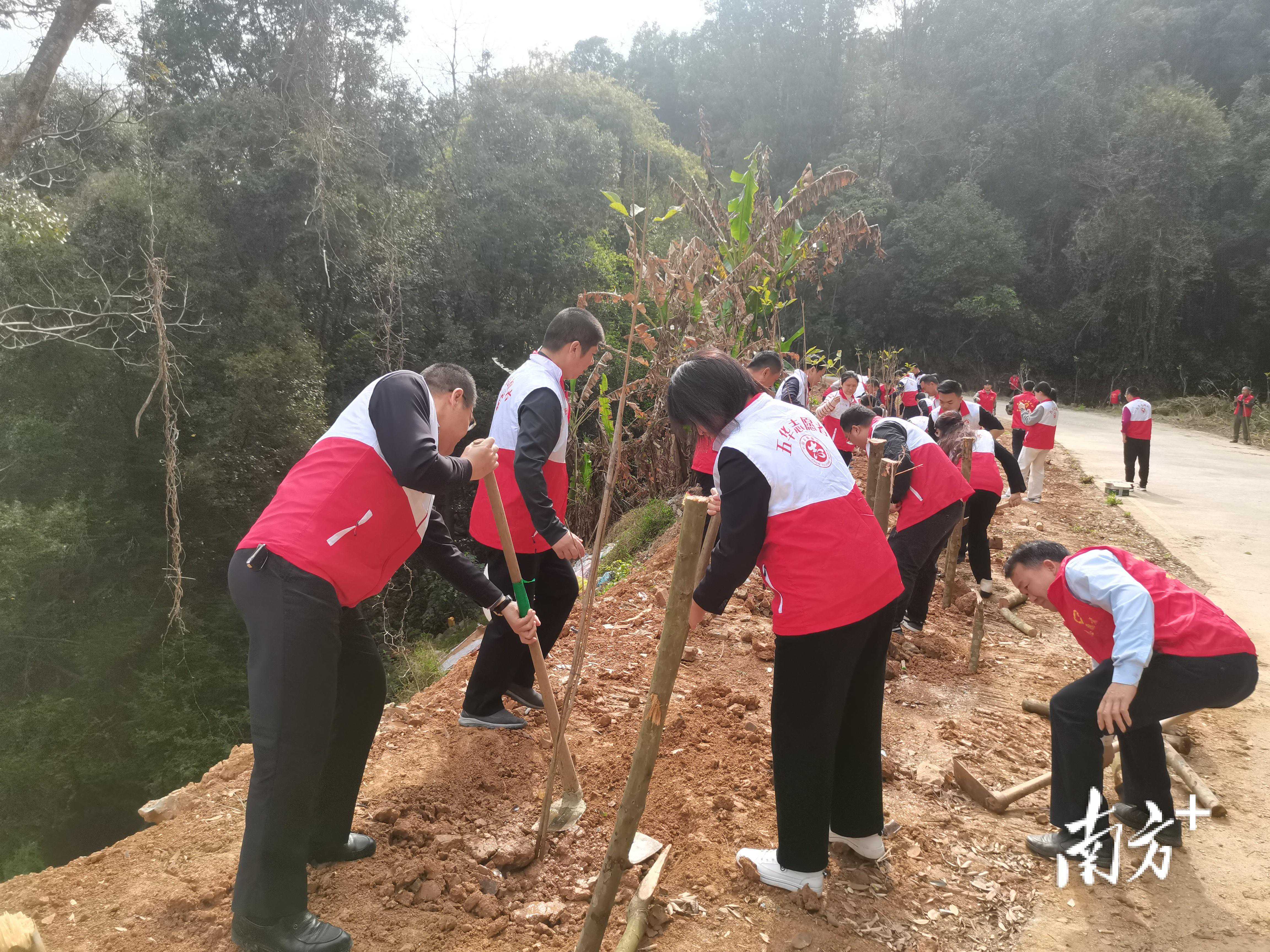 植树现场,五华县医保局的全体党员干部、预备党员、部分团员,身着红马甲,拿起锄头、铁锹,和镇村干部、回乡联村工作队分工协作,挥锹铲土、扶植苗木、培土压实、浇水灌溉,齐心协力栽下一棵棵树苗和希望。两村的村干部表示,作为农村基层党员,将以实际行动影响和带动群众自觉参与植绿护绿,让乡村绿起来、美起来。