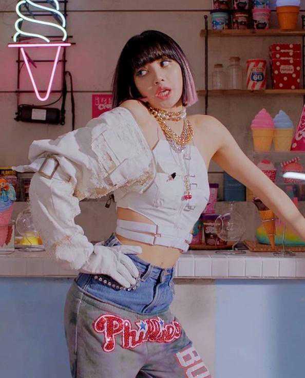 作为本次mv出镜率最高的成员,LISA的穿搭可谓是教科书级别的好看。首先下面这套挂脖吊带加长筒牛仔裤,搭配金属项链和亮片印花,简直就是在甜美里飒气,在酷炫里可爱。这套穿搭也很偏美式复古,加上粉黑色挑染发型与蕾丝手套,是不是有Y2K内味儿了!
