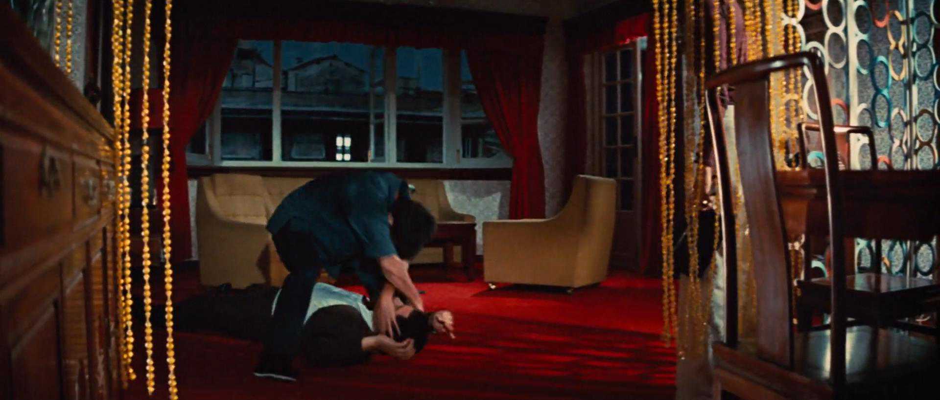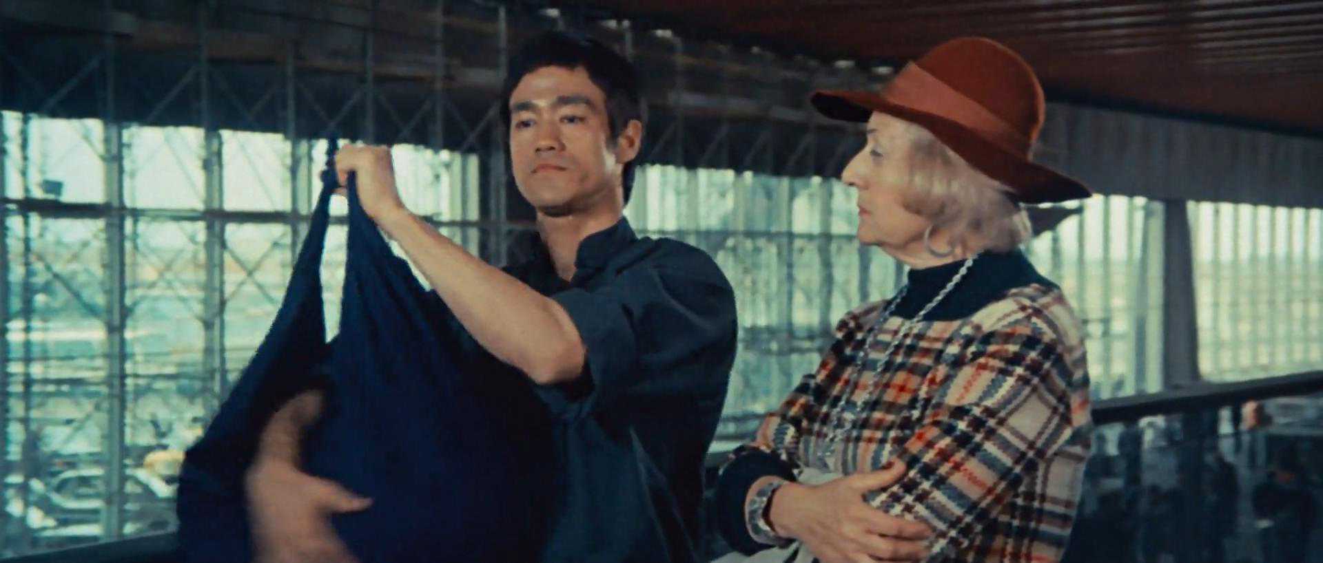 这里是一个很值得推敲的地方,轻描淡写,但是讽刺意味十足。李对报中国名字的人都十分尊重,包括前面与绿花衣服的阿昆见面时,李小龙也是“昆哥”叫法。其实在国内,随随便便取个英文名并以此自称并没有什么,但到了国外,遇到一个中国人,自报一个中文姓名,真的是亲切、欣慰,安全感油然而生。