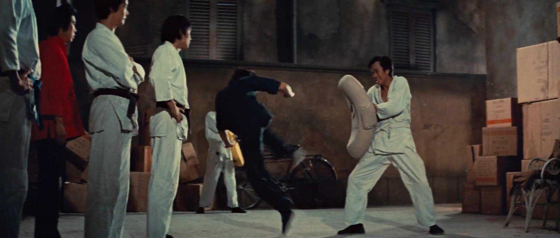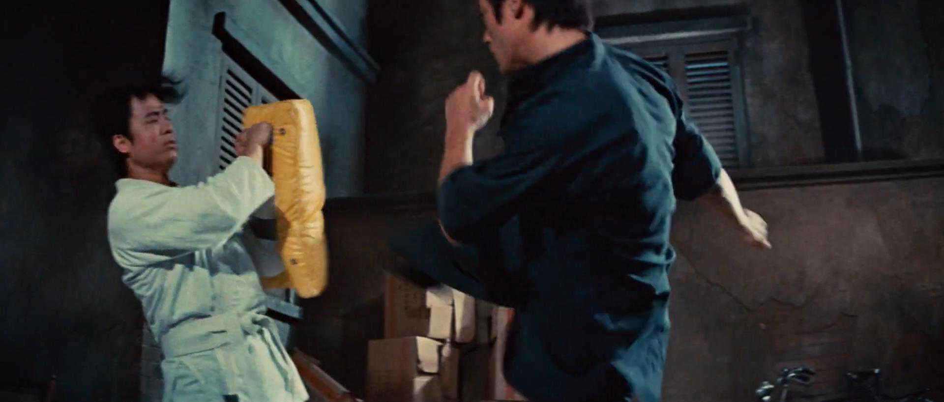 这一场景展示了两种腿法,尤其是侧踢。俯冲惯性势+稍向上踢=最强侧踢,这里的稍向上踢非常难,而且训练的难度系数也非常大。但是用“最难帧法”训练,便可以循习渐进,李小龙已经给我们展示了: