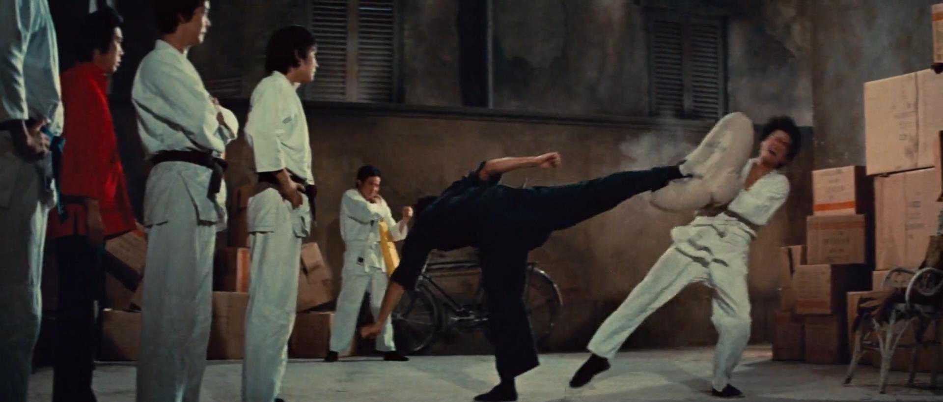 面对只会王八拳的搏击白痴,踢击是最有效的打击手段(一是攻击距离更长;二是维持下盘稳定就让普通人速率很低了,面对李的高速回旋踢无从反应)。一记回旋踢,高踢扫脸,结束与路人甲的搏斗。