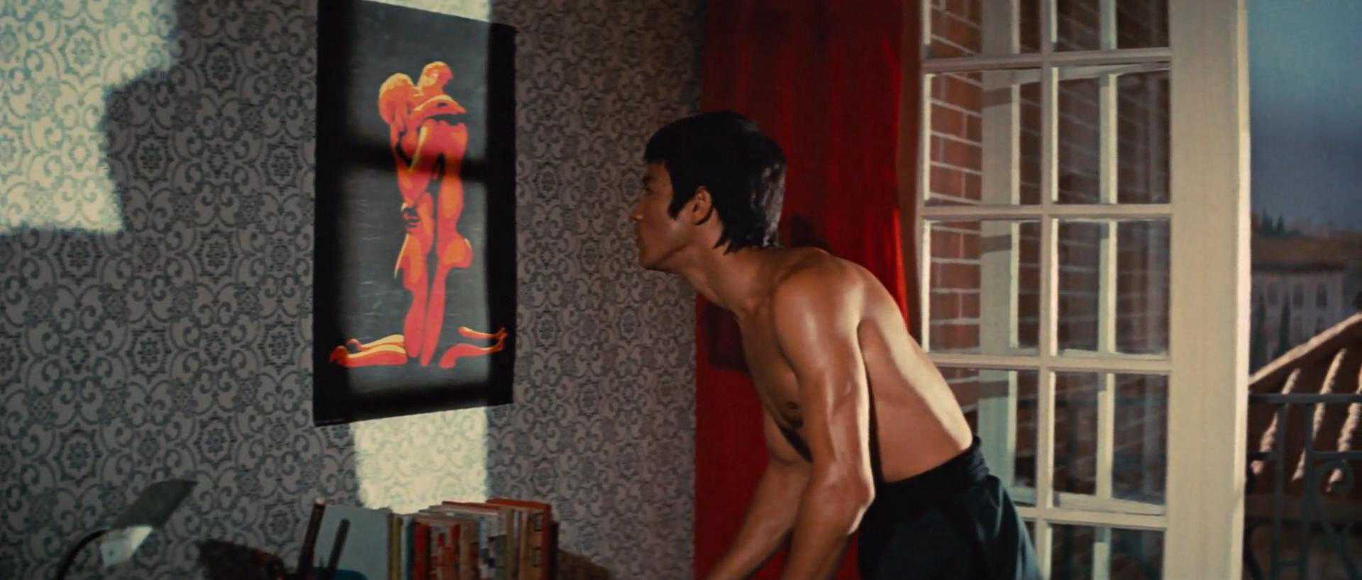 色彩鲜明,对比强烈,李的民族气节太耀眼了。李小龙的所有动作电影中,都对着装很重视,也不是什么高雅的唐装汉服,就是时下寻常的中华服饰。这份民族自信力,在朴素的着装中尤为凸显。