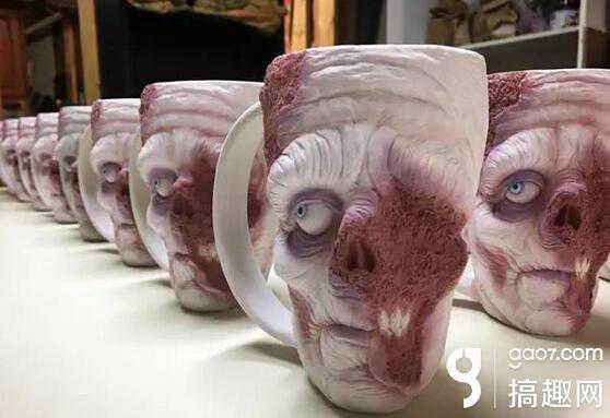 这其实是绰号为“Turkey”的工匠KevinMerck设计的“末日僵尸马克杯”(SlowJoeZombieMug)。因为是手工打造,长达一个月甚至更长时间的制作过程让每一个杯子都狰狞得各有特色,血液、烂肉和眼球元素一个都不缺,保证让你看了就精神昏迷。杯子用陶瓷和环氧树脂制作,经过1000多摄氏度炉火的淬炼,保证安全无毒,还能用于洗碗机和微波炉,简直和真实的僵尸一样瓷实呢(微笑)。