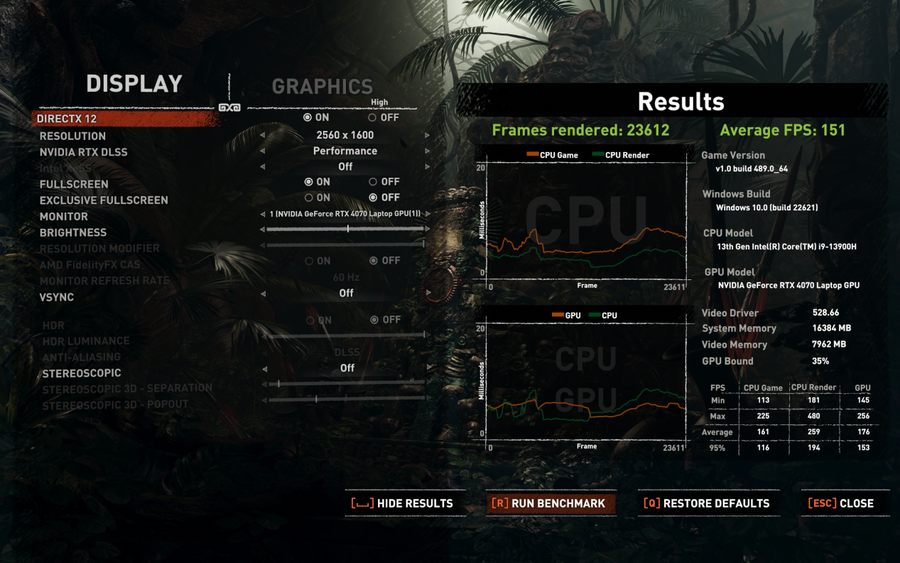 传统3A游戏大作在ROG幻16上也有着同样出色的表现,比如《古墓丽影:暗影》,在【2.5K分辨率】【高画质】,DLSS【性能】模式下,测试的平均帧率可以达到151FPS。