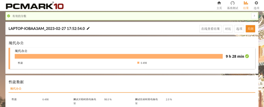 续航方面,我们选择核显输出,配合省电模式,屏幕亮度调至40%,使用PCMark10现代办公续航测试,实测最终的续航时间达到了9小时28分钟,续航能力非常强悍。