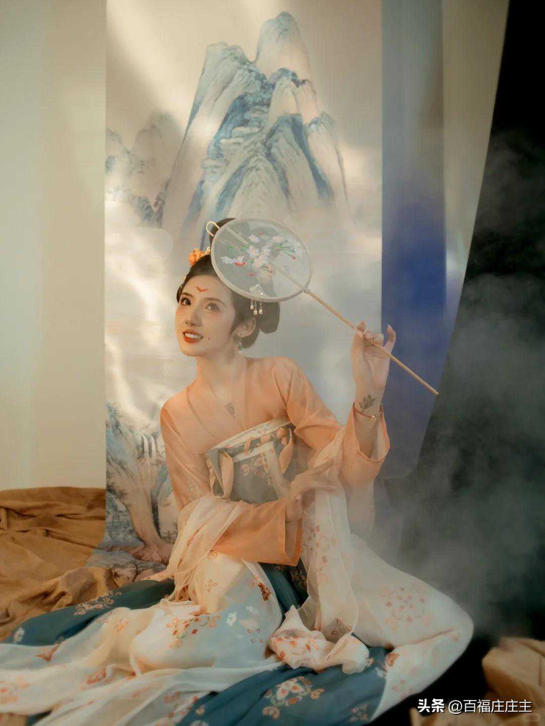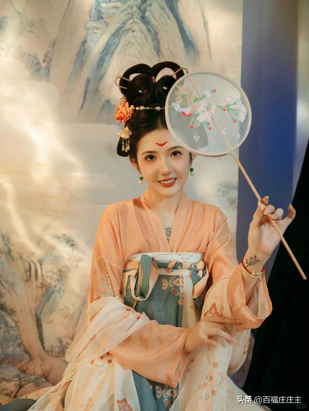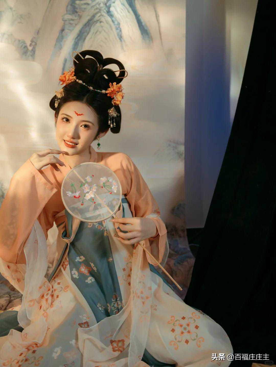 她手持一把团扇,那团扇上绣着精美的图案,与她身上的橘色襦裙相得益彰。她轻轻摇动团扇,那风姿绰约,宛如春风拂面,让人心旷神怡。每当她掩面轻摇团扇时,那娇羞的神态更是让人心动不已。