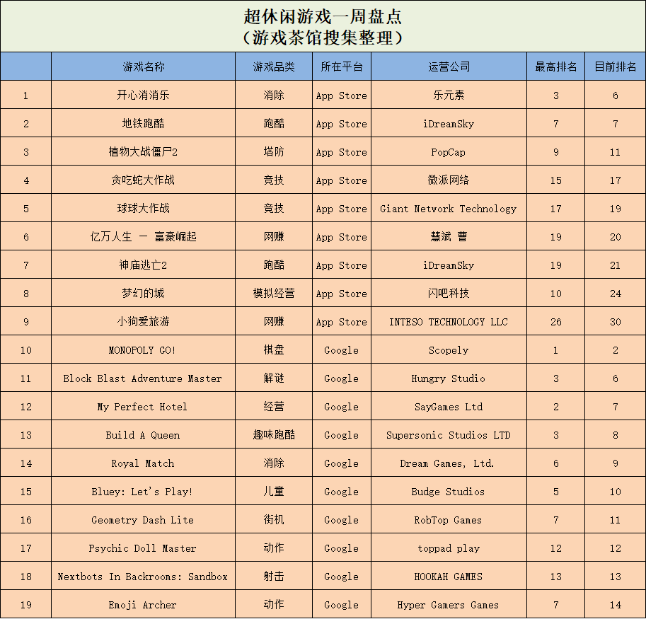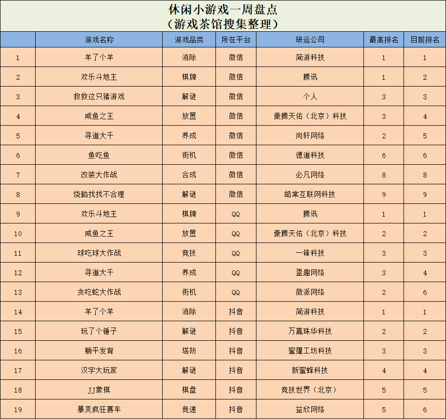 休闲新游周报每周统计微信小游戏、QQ小游戏、抖音小游戏、硬核小游戏以及AppStore和GooglePlay上的新游爆款,并按照分类制作表格,将游戏排名情况等信息公布,希望给到行业同侪帮助。