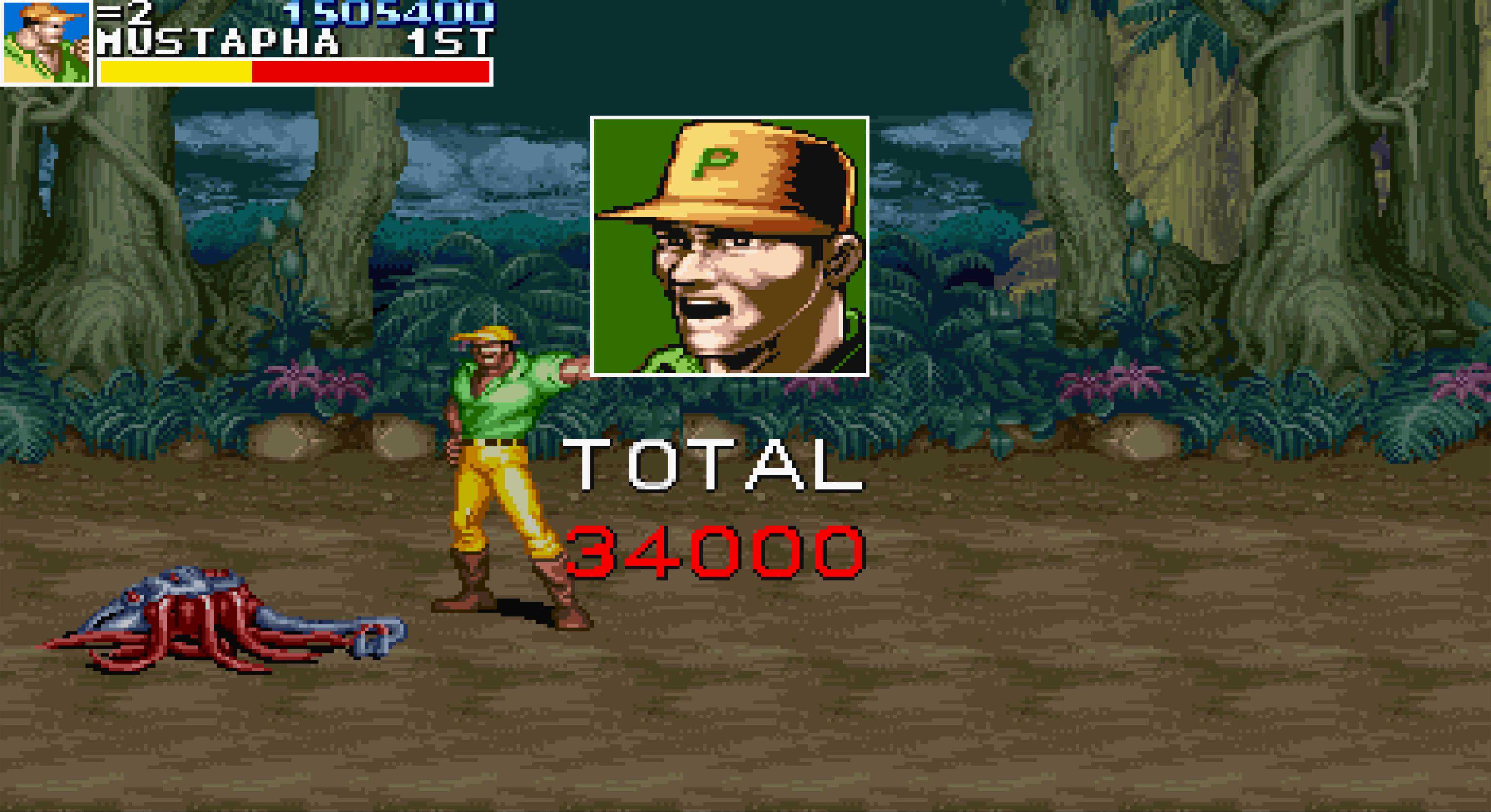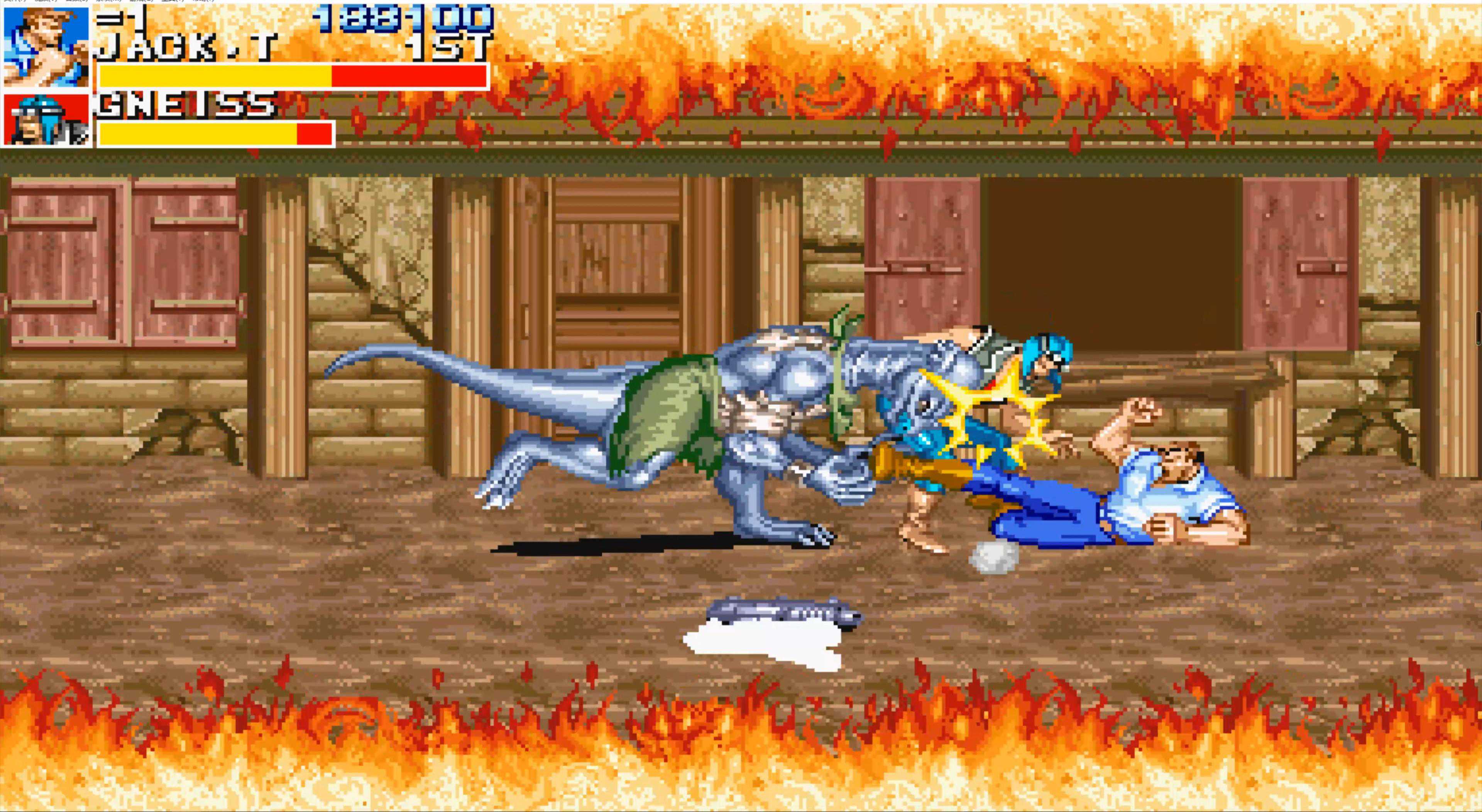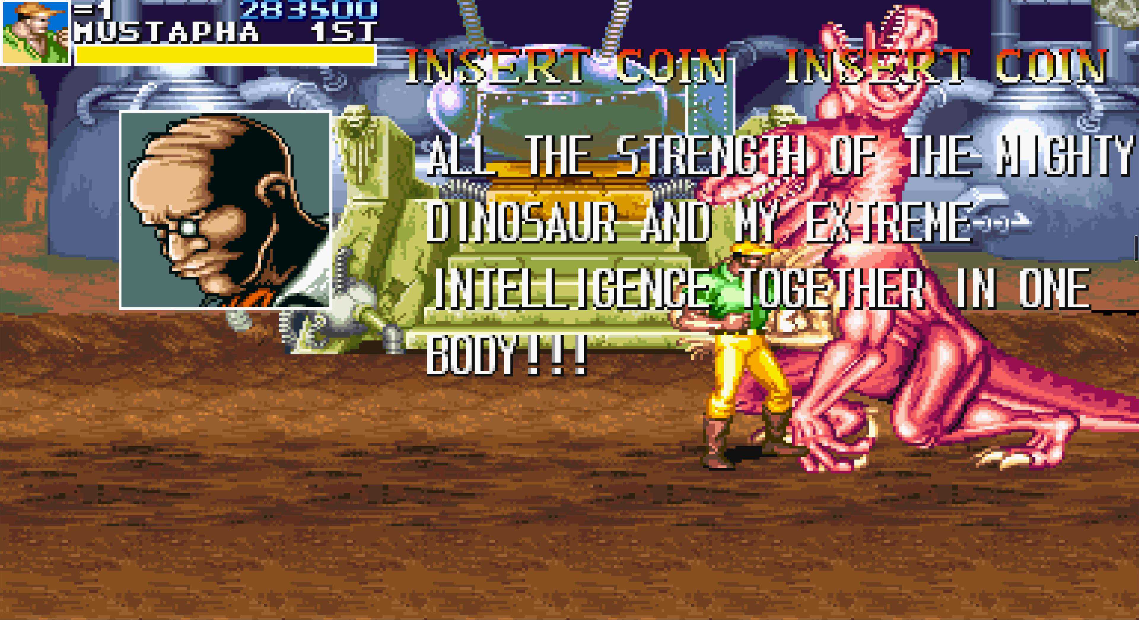 这是“恐龙快打”中最难的一关,在所有老卡的横版街机游戏中,这个BOSS的难度也是排得上号的,小时候玩基本两三条命就扔在这里了。即使现在,我除了用黄帽能有六七成把握一命过关,其他角色依然非常困难。至于安全打法……嘿嘿,没有,反正我是研究不出来。用黄帽不用多说,他的飞踢距离远、速度快,很容易同时控制住两人,且能跳过BOSS的冲斩,相对要简单许多。若是用其他角色,我只能说几个要点:
