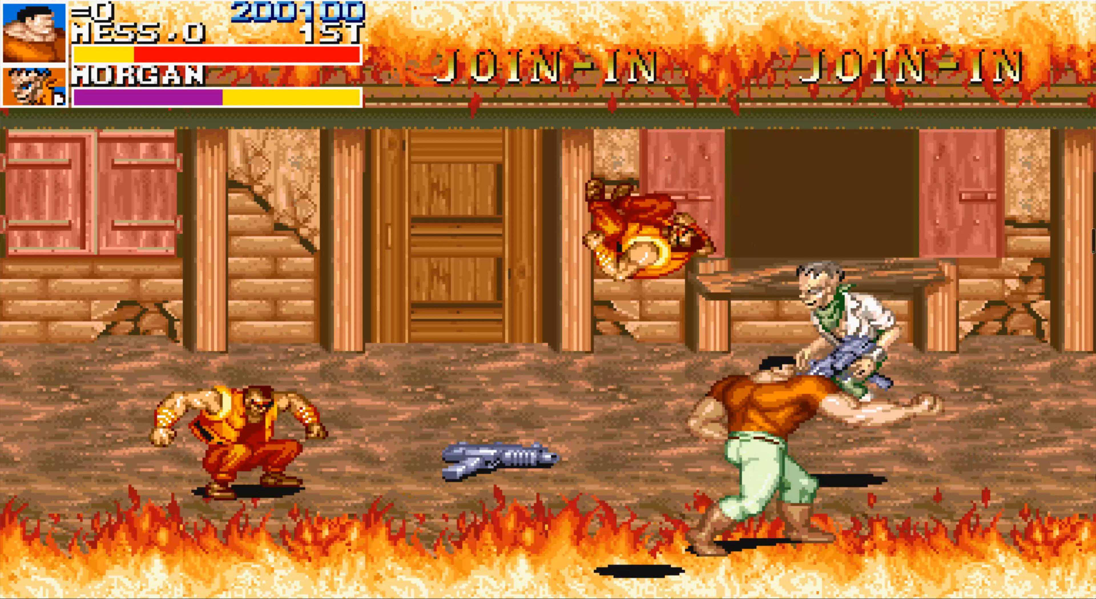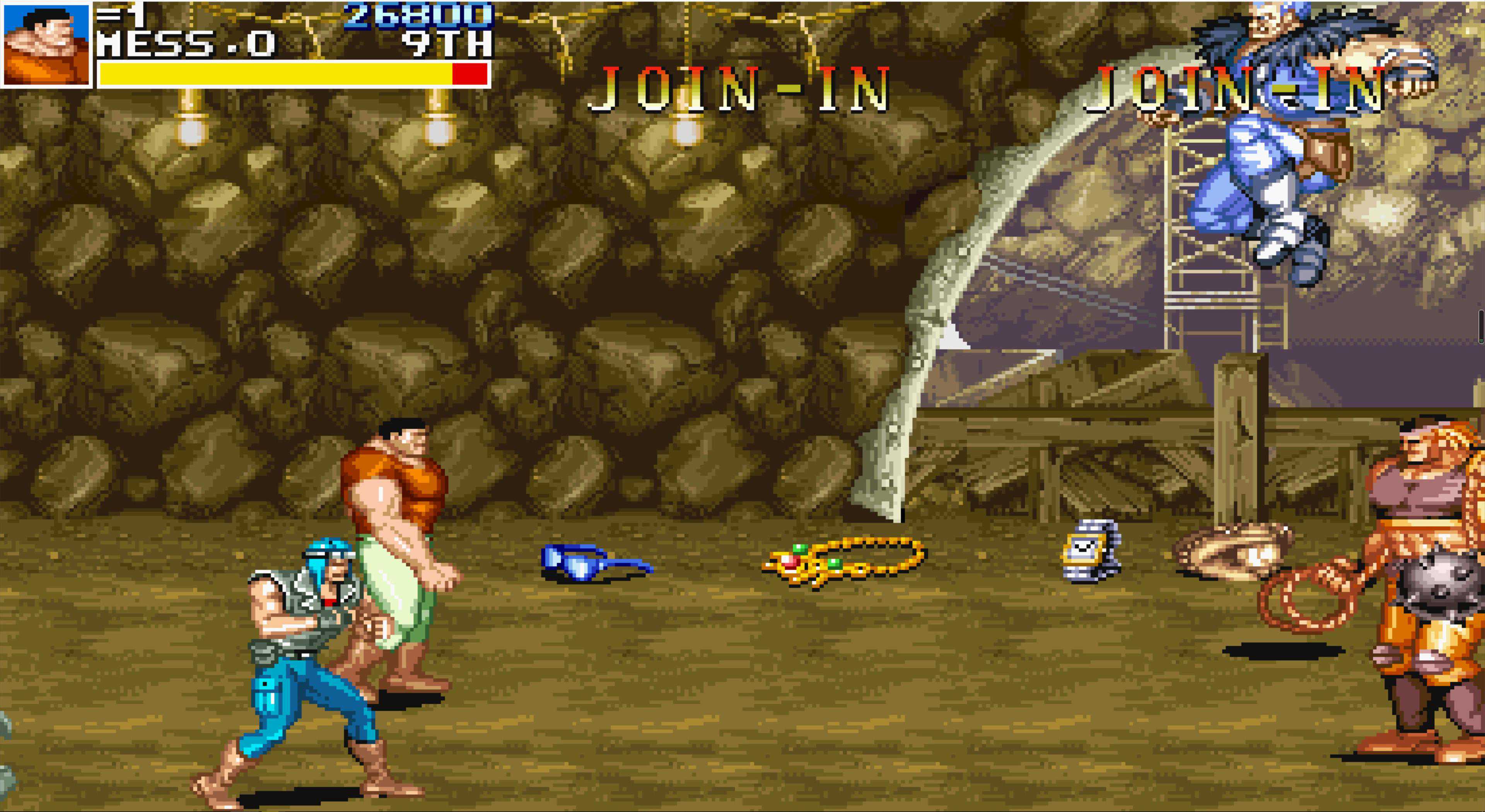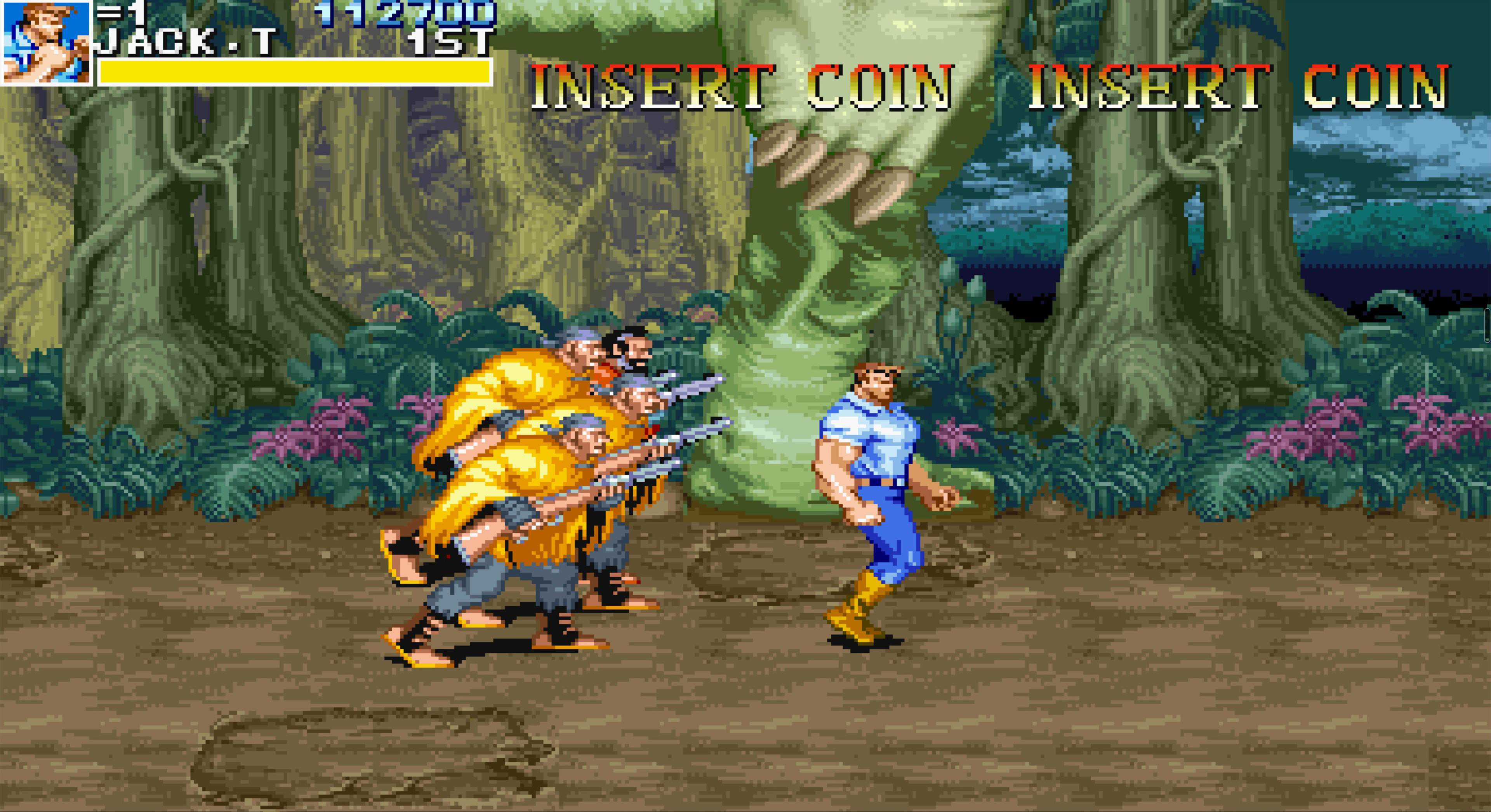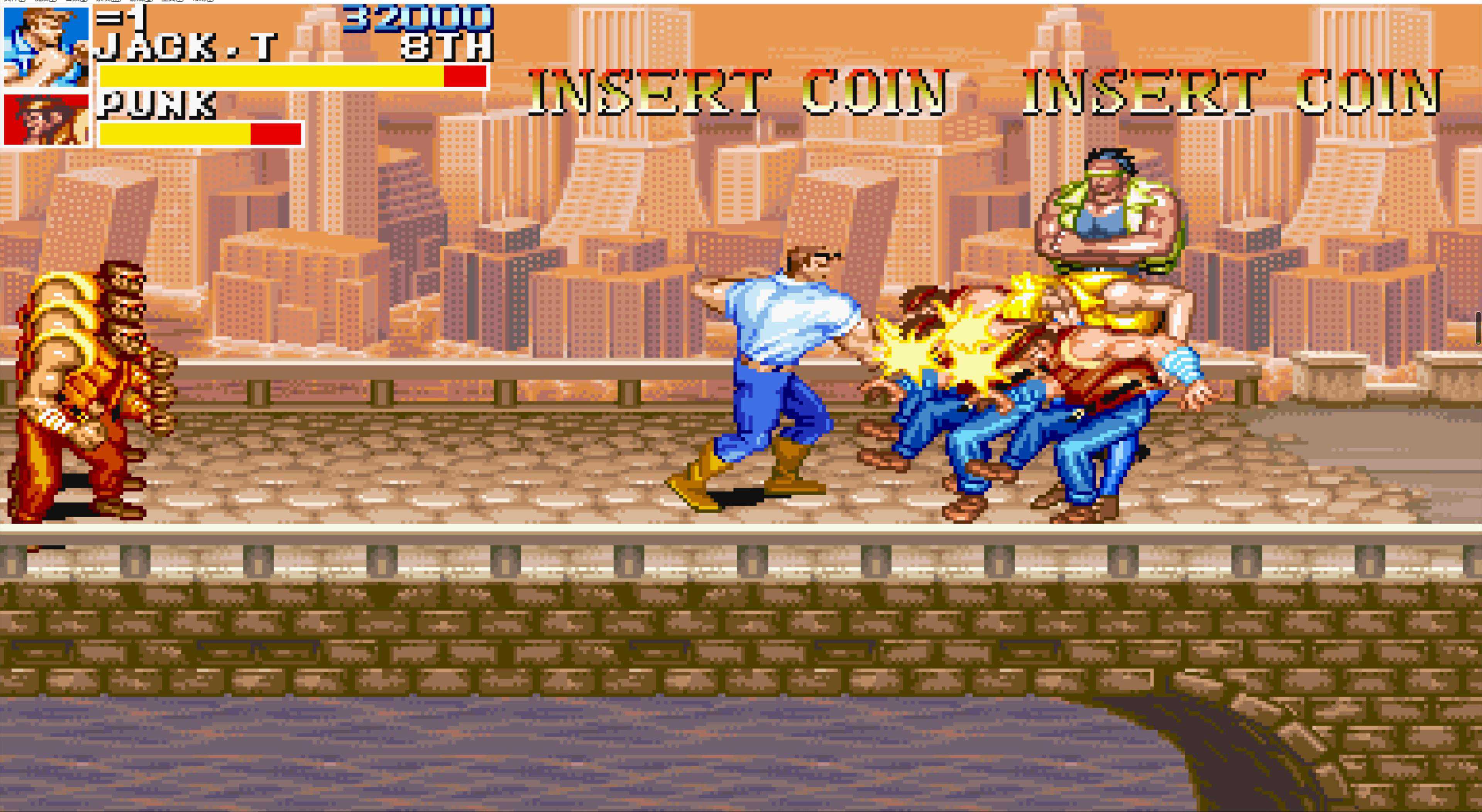 这是“恐龙快打”中最难的一关,在所有老卡的横版街机游戏中,这个BOSS的难度也是排得上号的,小时候玩基本两三条命就扔在这里了。即使现在,我除了用黄帽能有六七成把握一命过关,其他角色依然非常困难。至于安全打法……嘿嘿,没有,反正我是研究不出来。用黄帽不用多说,他的飞踢距离远、速度快,很容易同时控制住两人,且能跳过BOSS的冲斩,相对要简单许多。若是用其他角色,我只能说几个要点: