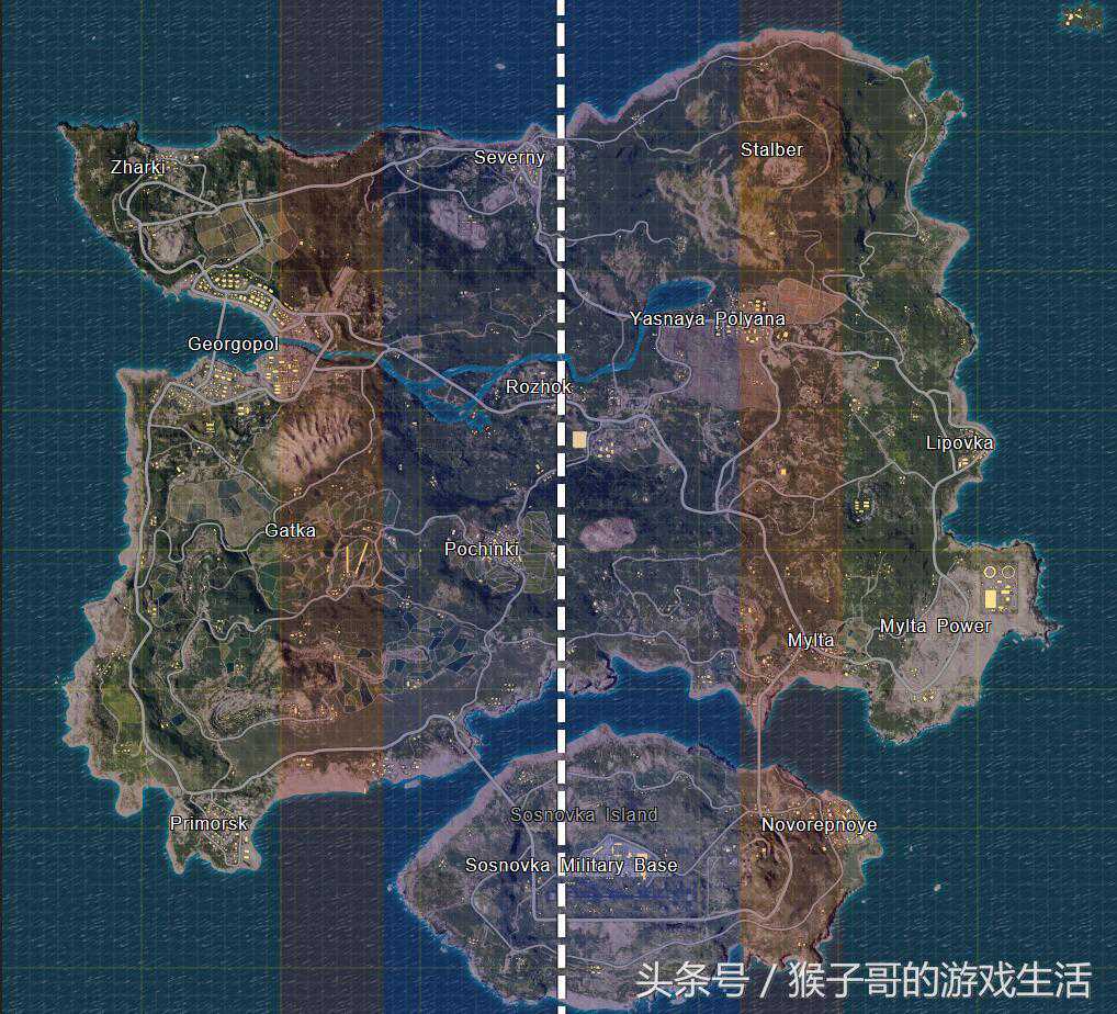 我们在选择降落点的时候,如果不想跟其他玩家刚正面,尽量要选择避开白虚线两侧的1200M范围。再结合物资图,熟练之后就可以找到人少、物资多的地方发育。
