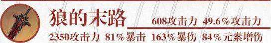 目前外观最契合迪卢克的双手大剑,提供了巨额的攻击力加成,缺点是想要毕业对圣遗物的要求非常之高,因为单狼末一把武器提供的攻击加成已经高达70%(5精炼下是90%),换言之,圣遗物副词条中的百分比攻击力/固定攻击力对狼末而言不再是优秀的词条了,需要圣遗物全力追求暴击率/暴伤,适当补充一点元素精通(120--180)。