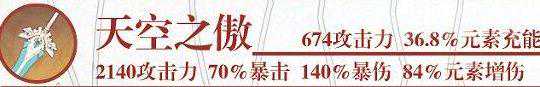 有着目前大剑武器中最高的基础攻击力成长(80级590点),并且特效在高精炼的加持下非常强势。天空之傲是一把精炼提升相当明显的武器,尽管如此,同为满精炼的情况下,对迪卢克的契合度依旧差了狼末一点。武器特效的物理剑气并不是很契合火伤为主的迪卢克;同时,副属性的元素充能对迪卢克非常鸡肋,成型的老爷队一般都会选用班尼特作为固定辅助,根本不缺元素充能。