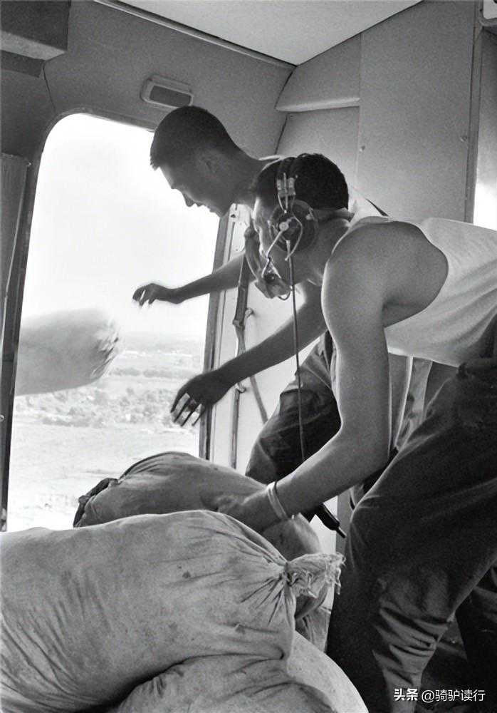机务人员系好安全带,打开舱门,战士们迅速将一箱箱食品投放下去。