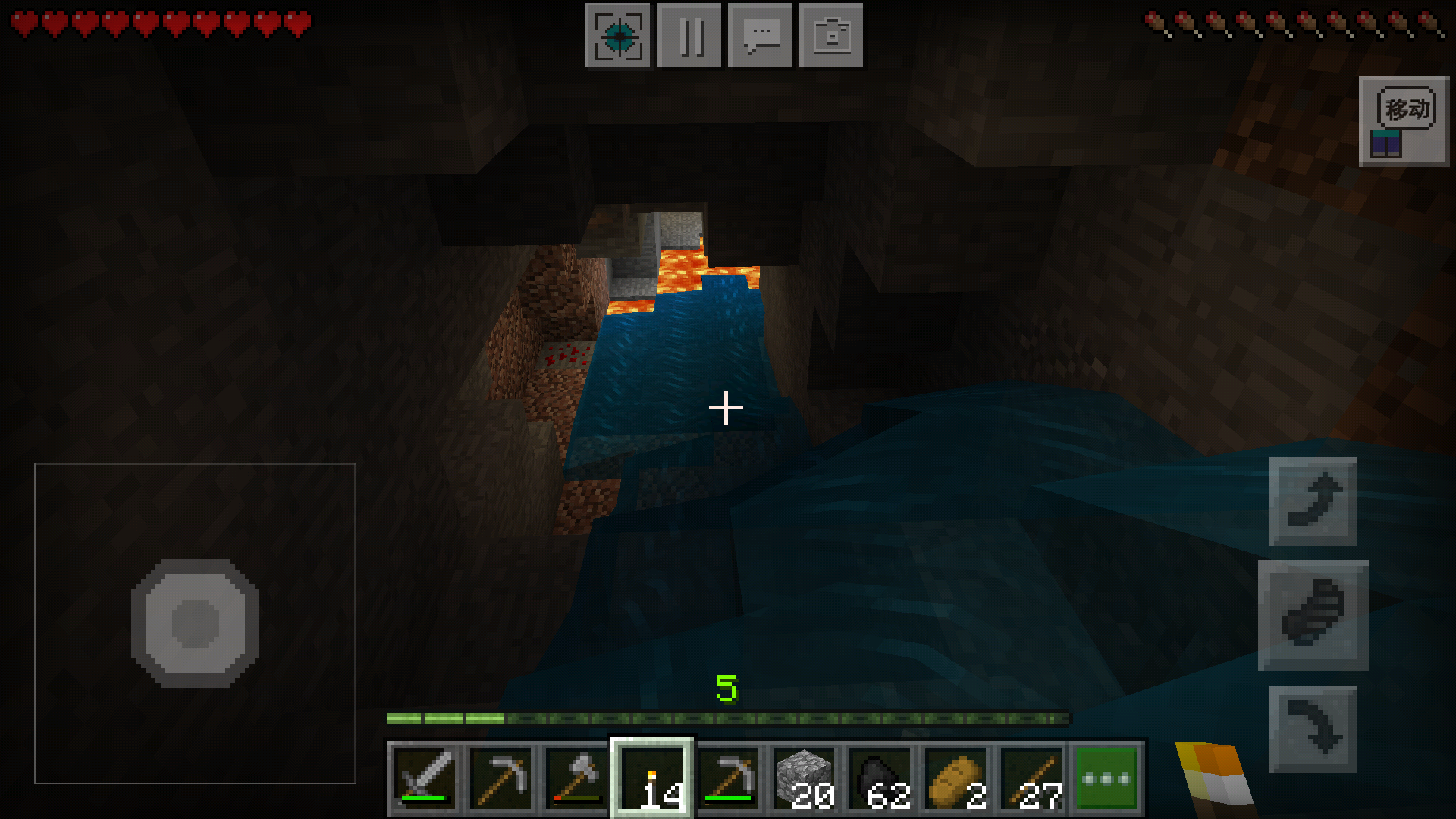 在这个似迷宫的矿洞里,小风一只往下走,终于看见岩浆了(在岩浆附近很容易找到钻石)