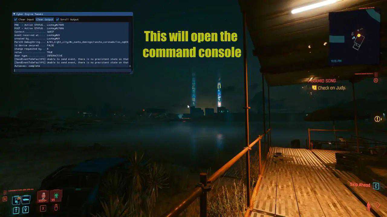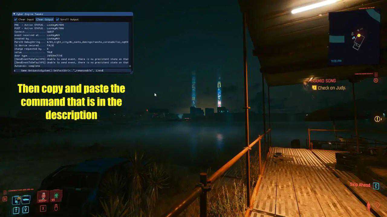 原本玩家必须是女性身体女性嗓音才能触发与朱迪的深入交流,不过通过使用控制台mod,修改一行代码“():SetFactStr(v.."_romanceable",1)”,就能让男性V和朱迪谈恋爱,并且在完事后,玩家在河边与朱迪的对话里,还有完整的男性V的配音,内容则是复刻的女性V的台词。