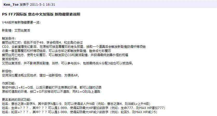 2011年,在时隔《最终幻想7》原版发售十四年之后,国内意志之路汉化组推出了《最终幻想7》魔改版,汉化组不仅汉化了游戏文本,还为游戏添加了新剧情“爱丽丝复活”,制作组还很贴心的在论坛里公布了这个剧情的详细触发条件。