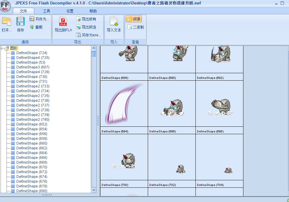 一、ffdec(JPEXSFreeFlashDecompilerFlash反编译工具)JPEXSFfdec是一款flash动画反编译工具,JPEXSFfdec主要用于编辑反汇编,支持flashswf、gfx、swc文件格式,可以导出脚本,图像,图形,动画,声音等。