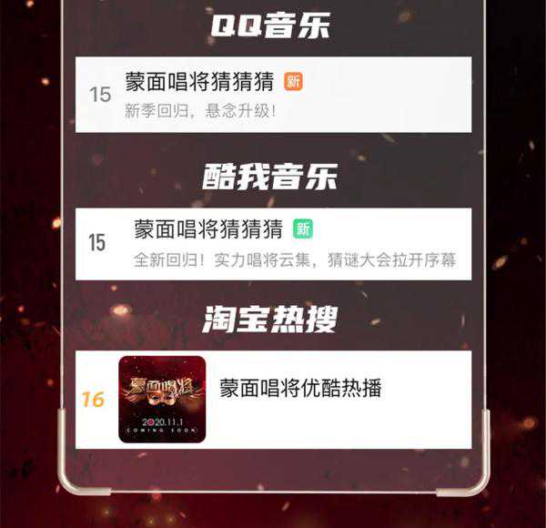 唱将们的卖力演出,让首期节目就惊艳四座。节目以CSM59城收视率1.28%、CSM35城收视率1.46%的成绩首战告捷,、、等话题冲进微博热搜榜前列,节目热度持续走高!