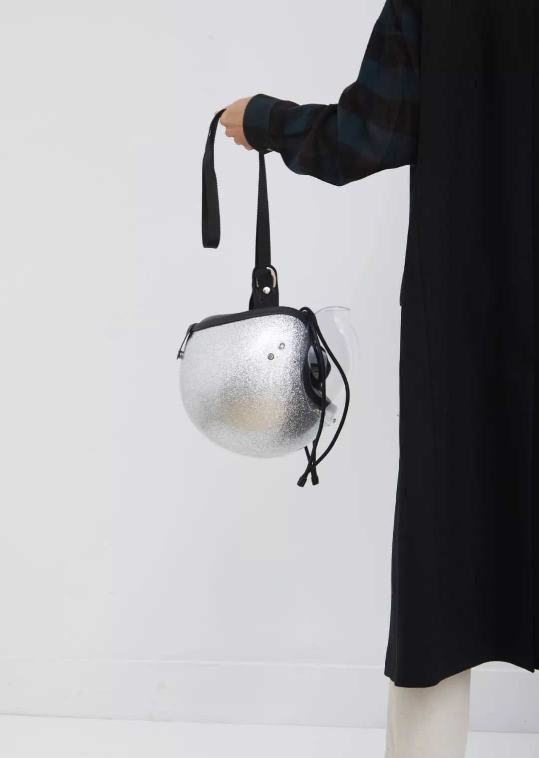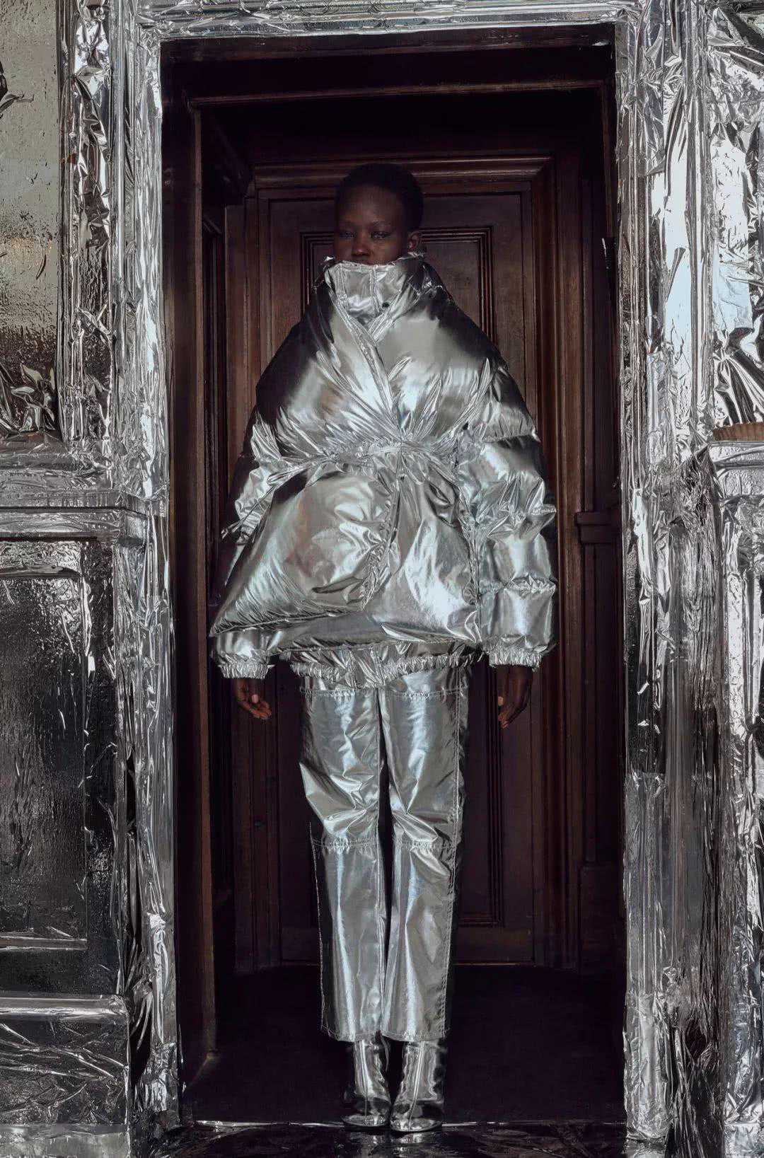 18年秋冬系列的主题色是富有层次的银色,此系列引用的经典形象则更多,如重新将头盔包加以改造重置大众视野,一度成为热门话题;将99年秋冬系列中的经典duvetcoat(棉被外套)的衣身改短并采用银色,改版后的短款棉被外套更好地贴合了实际的日常穿着需求。