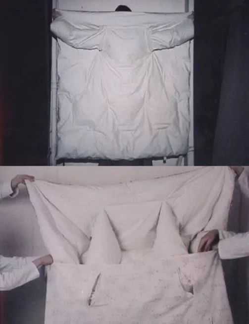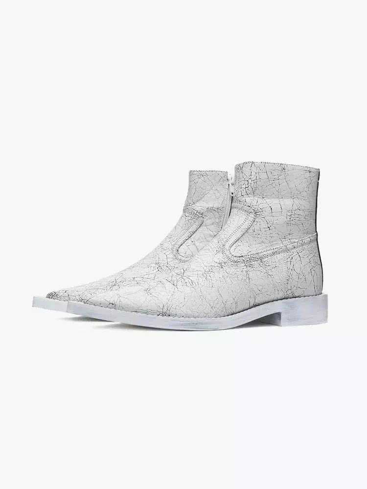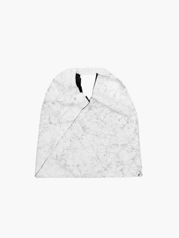 用白色喷漆来覆盖曾是Margiela常用的表现手法,厚重的喷漆干后形成的裂纹亦是MMM的一个标志符号,这种裂纹纹理经复刻再印上单品里,可穿性大大提高。这实际上是将个性建立在日常穿着的需求上,也很好地印证了MM6成衣线注重实用这个概念。
