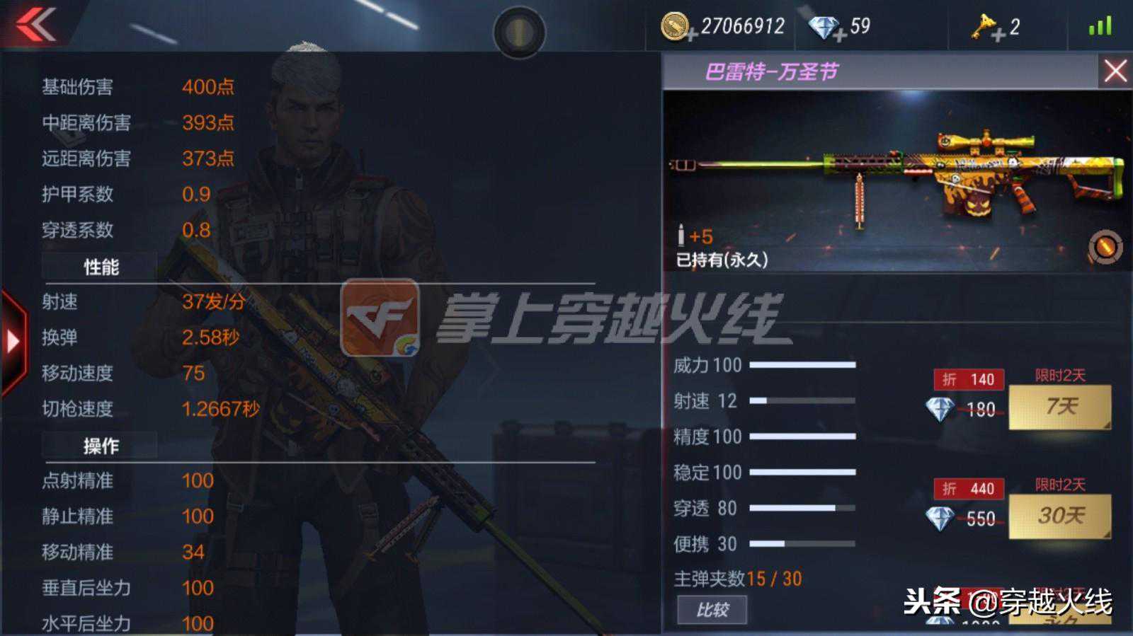 这款巴雷特可以说是万圣节四件套中性价比最高的了。商城中直接售卖过的巴雷特系列只有三种,一种是长期存在的原版巴雷特,一种是元宵节活动或者黑市才会出现的春雷大炮,还有一种则是价格比较昂贵的赤龙巴雷特。对于脸黑抽不到战龙大炮,又不想花那么多钻石买赤龙大炮的玩家来说,入手这次的巴雷特-万圣节绝对不亏。