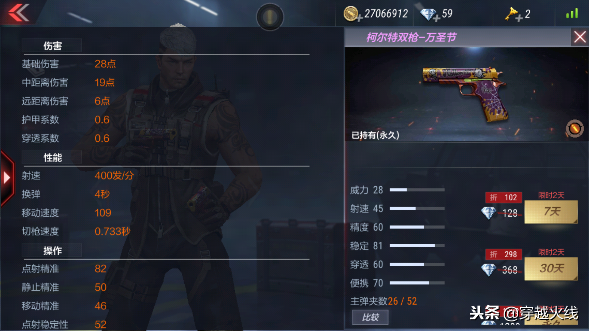 这把枪是继双持格洛克之后的第二把双持副武器,但是各方面性能却差强人意,首先它的主弹匣载弹量就比双持格洛克(40/120)少了14发,详细数据对比请看下图