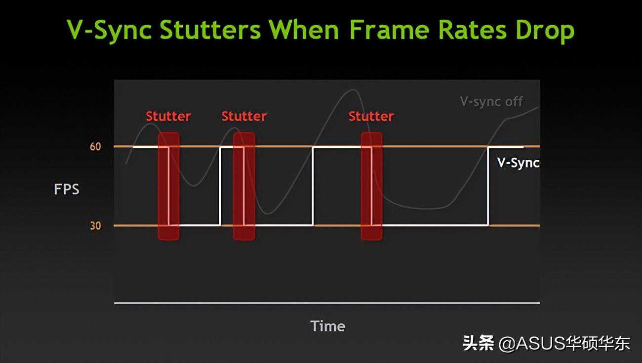 NVDIA对传统垂直同步造成卡顿的解释:在启用垂直同步时,如果帧速率降至显示器的刷新率以下,帧速率就会剧烈波动,导致明显的卡顿现象。