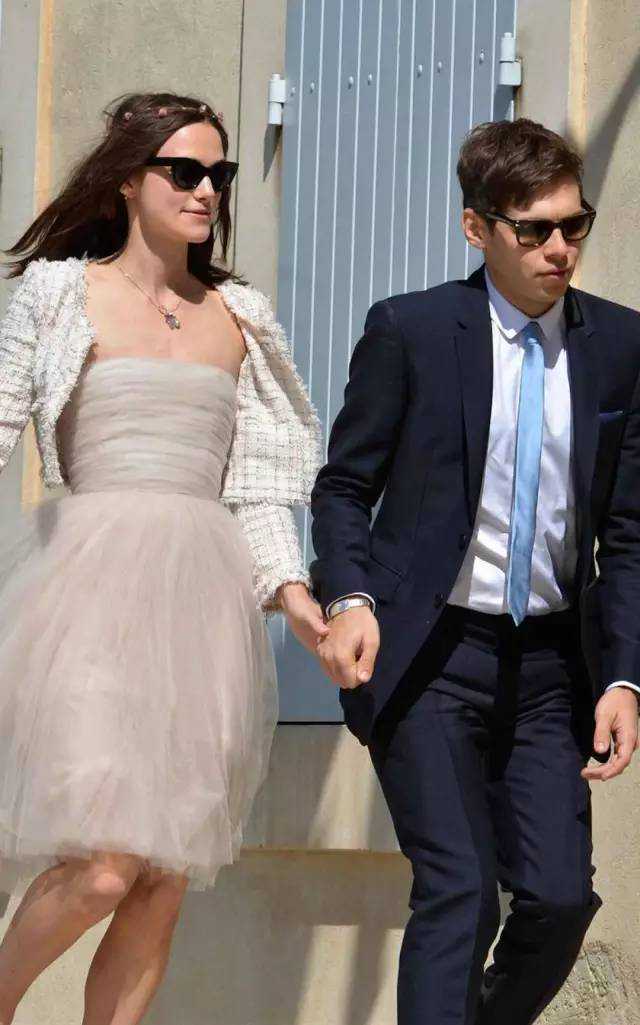 2.2013年,KeiraKnightley和JamesRighton在法国南部完婚。KeiraKnightley穿了一件及膝的香奈儿裙装,搭配了一件小夹克。这场婚礼,KeiraKnightley甚至没有穿高跟鞋,取而代之的是一双芭蕾平底鞋。