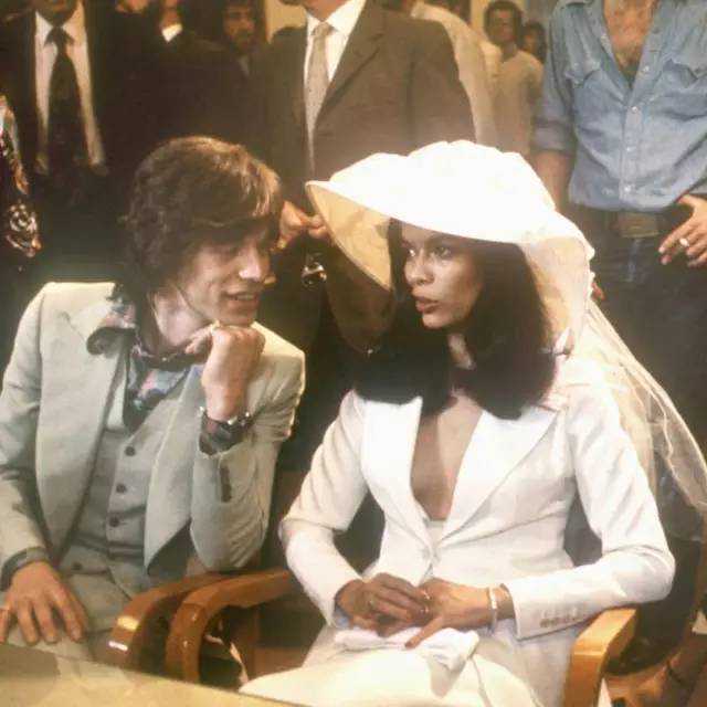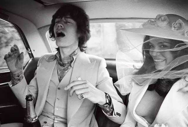 4.1971年,滚石乐队的主唱MickJagger迎娶BiancaPérez-MoraMacias,新娘Bianca决定不穿传统的长婚纱裙,她用YvesSaintLaurent的白色吸烟装夹克搭配一件白色长裙。