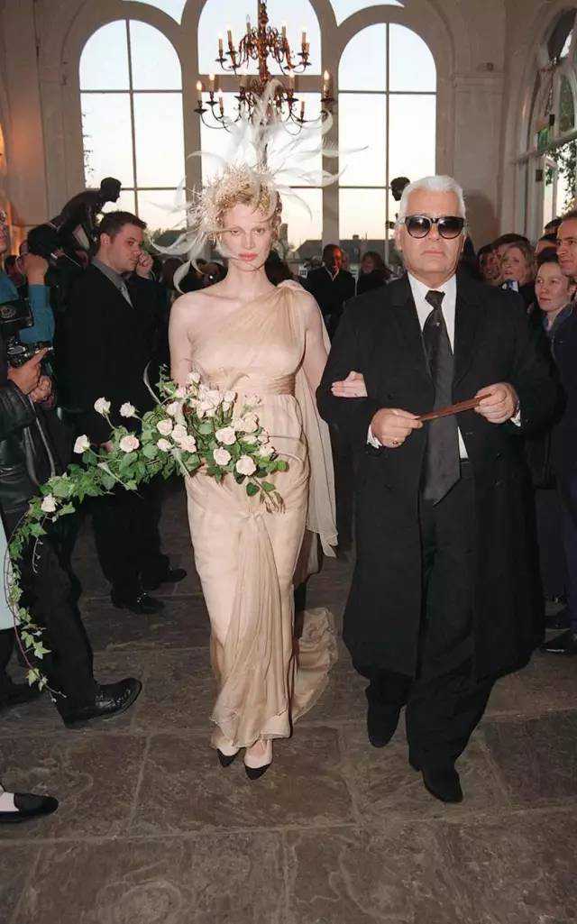 3.超模KristenMcMenamy,老佛爷KarlLagerfeld亲自为她做了婚纱。1999年,KristenMcMenamy穿着老佛爷设计的香奈儿高级定制婚纱,挽着老佛爷的手臂走进教堂,与MilesAldridge完婚。礼帽是PhilipTreacy做的。