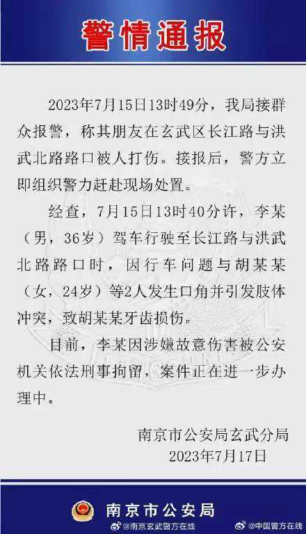 7月15日,南京闹市街头发生一起打斗事件,一名光头男子与一名年轻女子在路口激烈打斗,光头男子屡屡出拳,最后女子被打倒在地,牙齿被打掉,男子扬长而去。目前此光头男被警方刑事拘留。