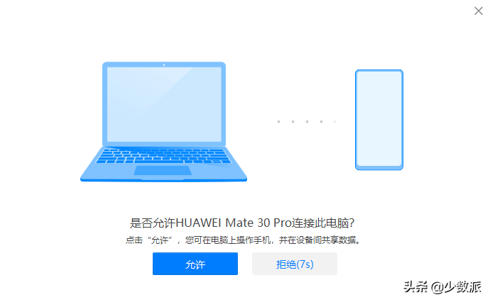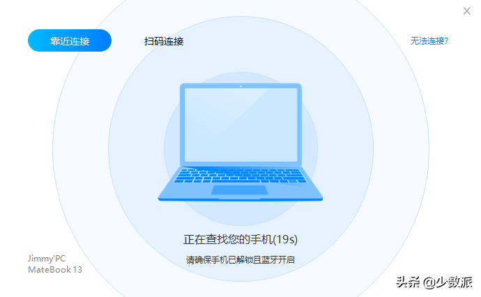 此外,华为还提供了另外两种方式;一种是「靠近连接」,将电脑和手机的蓝牙打开,手机保持解锁状态,电脑就可以自动发现手机并建立连接: