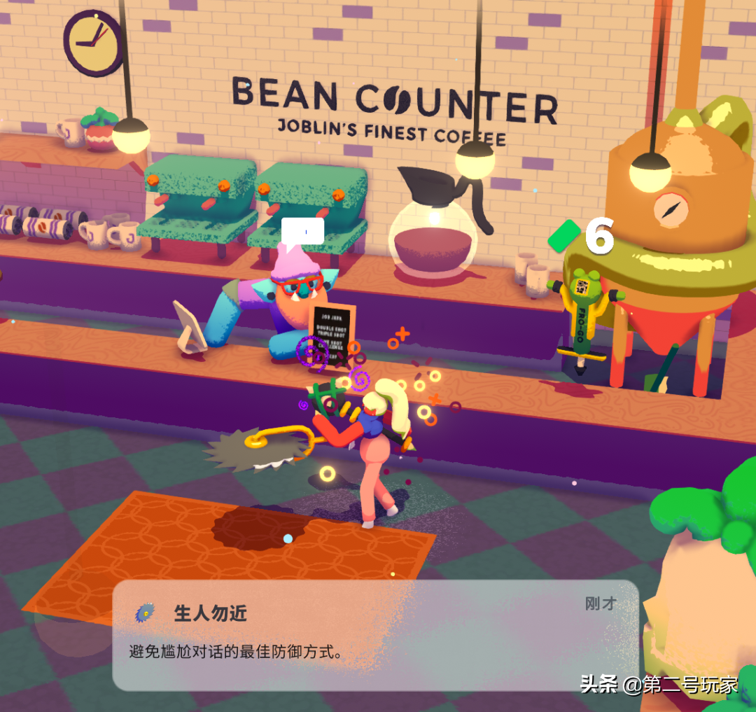 在打败每一层的Boss之后,洁奇会从前老板们的手中夺取他们的圣物装饰在自家公司的大堂中——一个咖啡豆罐头和一个面具。
