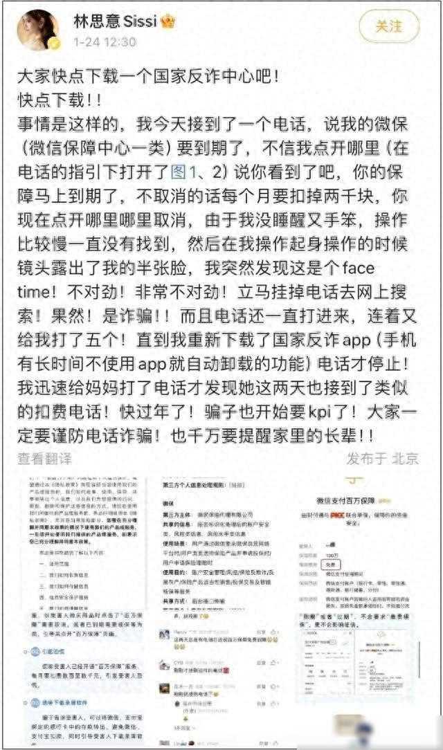 林思意的遭遇,似乎点燃了整个娱乐圈的“防骗”热情。她在微博上描述,自己在半梦半醒的状态中接到一通电话,对方声称她的微信保障即将到期,不取消将每月扣除两千块。在迷糊中,她被骗子巧妙引导取消所谓的保障,直到操作时镜头露出自己的半张脸,她才发现这是个FaceTime,意识到自己差点被骗。在微博上呼吁大家警惕电话诈骗,同时推荐下载国家反诈中心(App)。