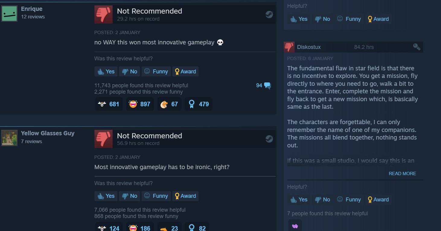 正如上图所示,《星空》Steam页面的最新评价大部分为差评,且直指该游戏最近获得的奖项。两位玩家的游戏时长均在30-50小时左右,但他们的负面评价指出,这款RPG并不值得在创新方面获得赞誉。
