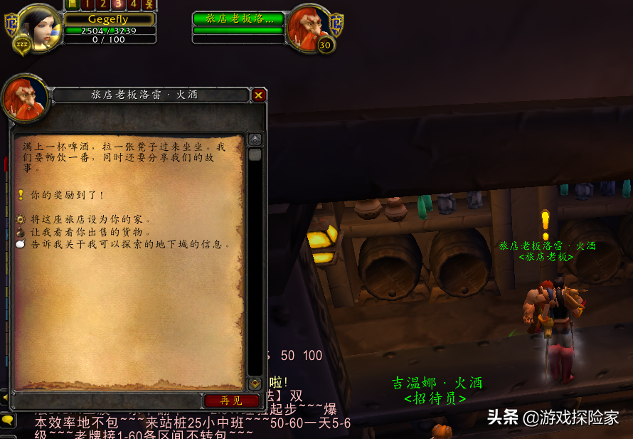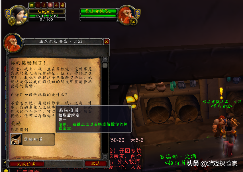 现在可以进游戏领礼物了,首先要取的礼物当然是我们可爱的熊猫宝宝。先去主城找到酒馆大叔,可以看到有一个任务:你的奖励到了!