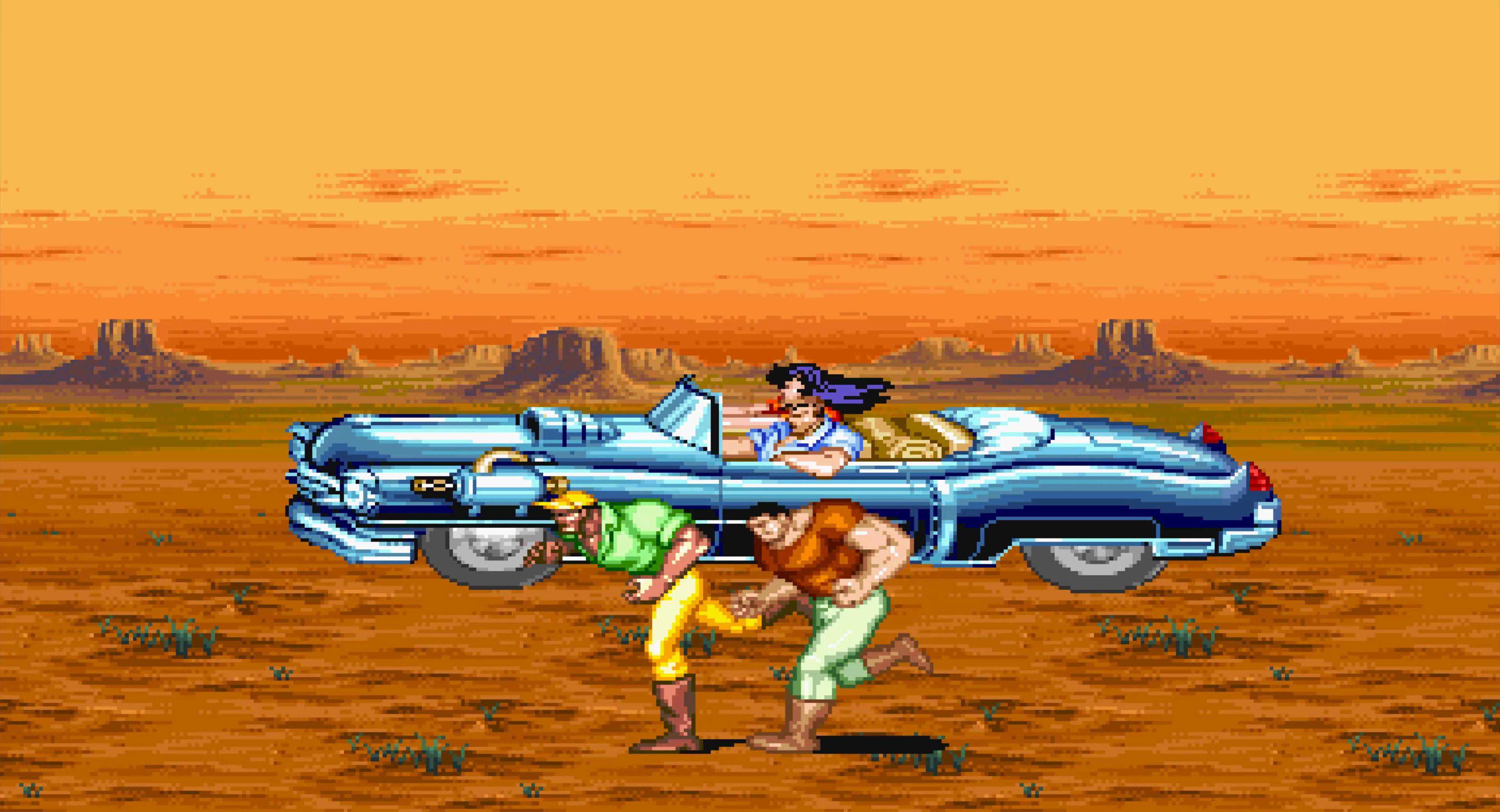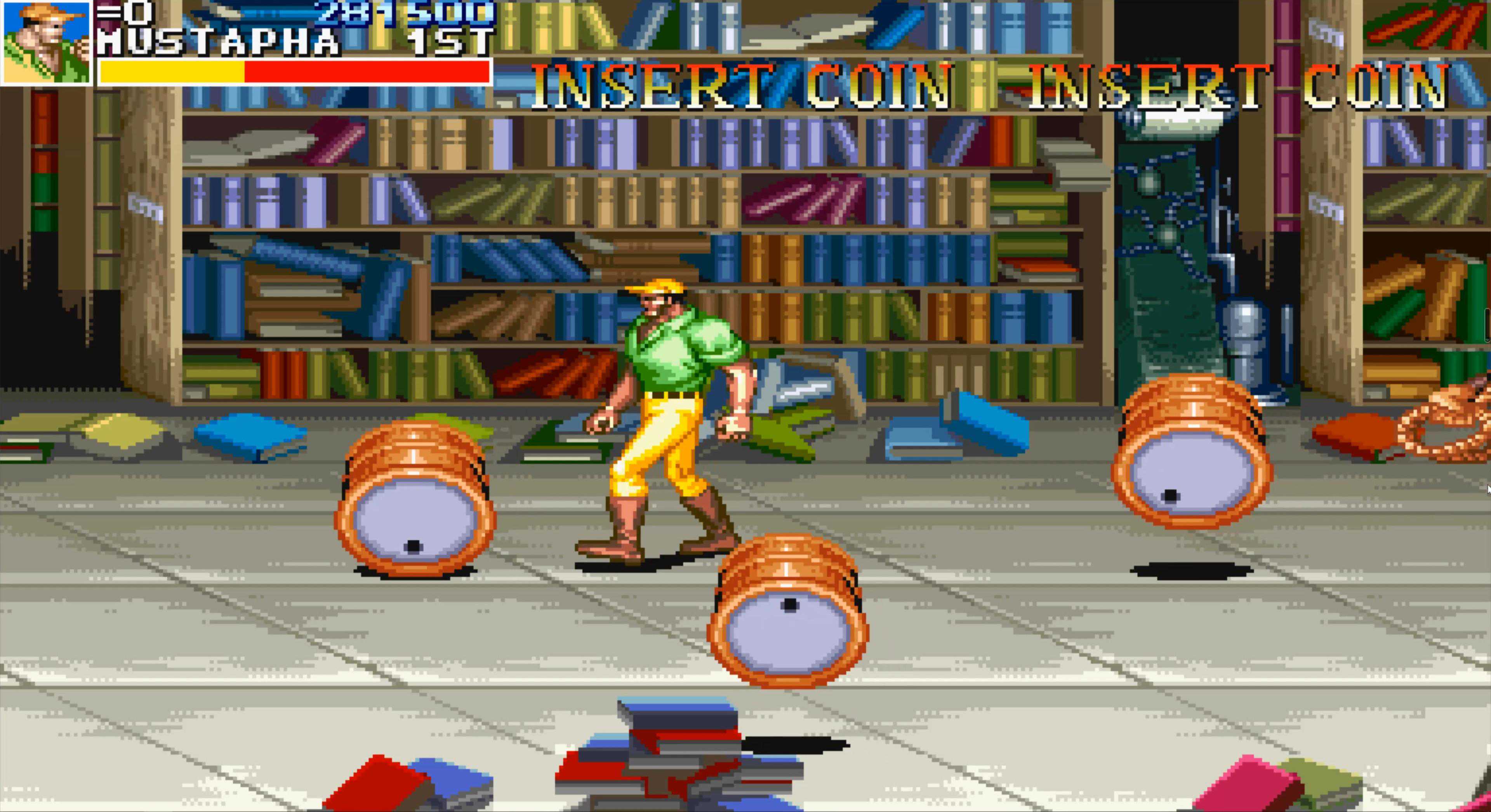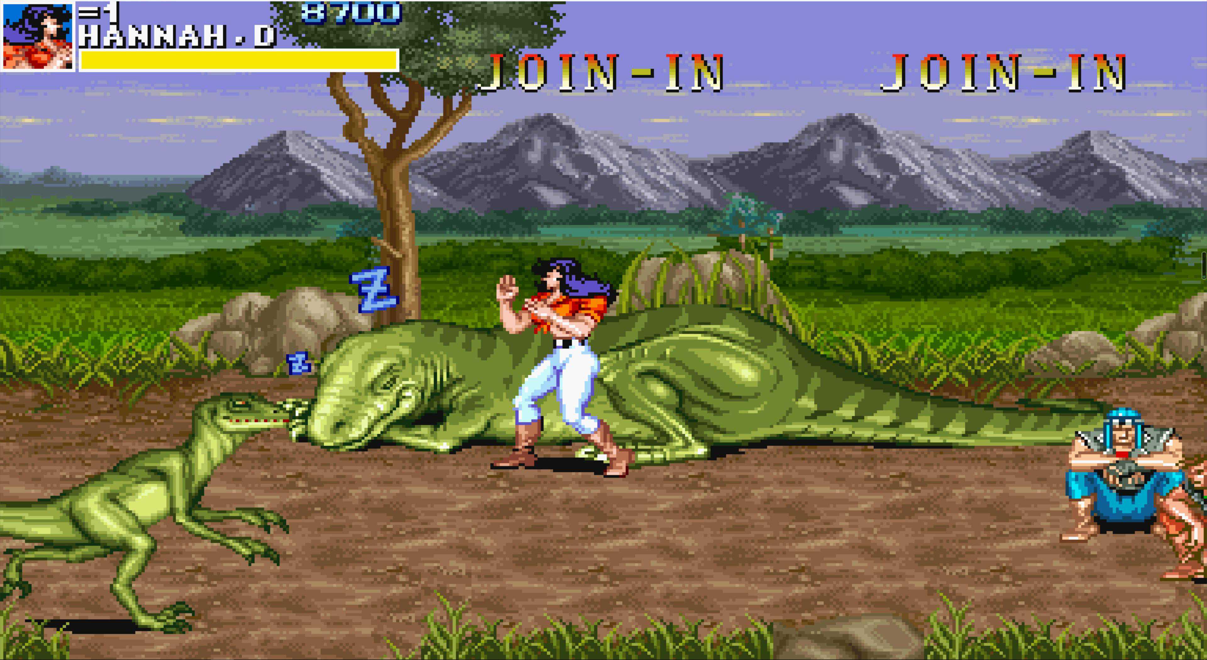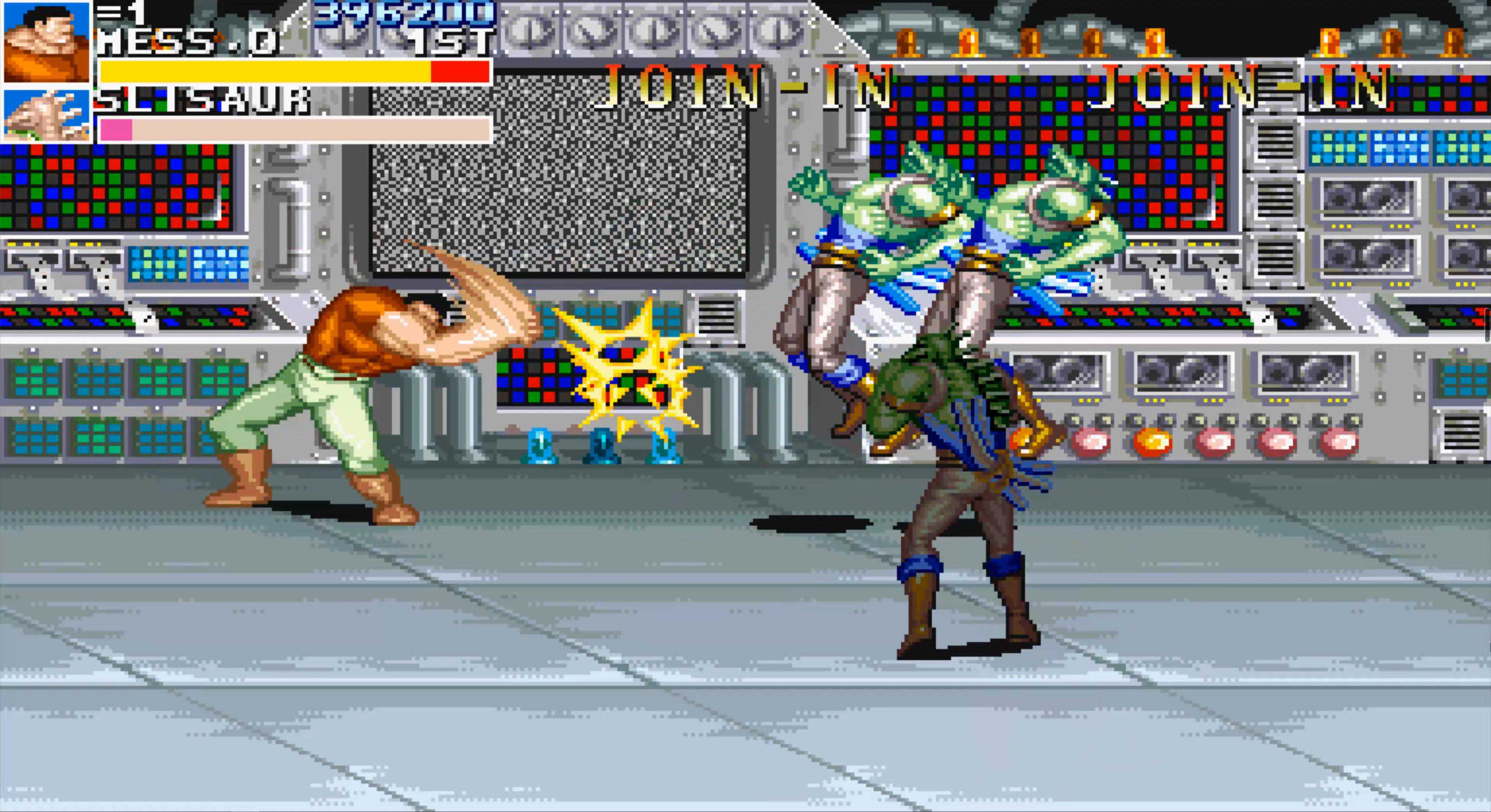 这是“恐龙快打”中最难的一关,在所有老卡的横版街机游戏中,这个BOSS的难度也是排得上号的,小时候玩基本两三条命就扔在这里了。即使现在,我除了用黄帽能有六七成把握一命过关,其他角色依然非常困难。至于安全打法……嘿嘿,没有,反正我是研究不出来。用黄帽不用多说,他的飞踢距离远、速度快,很容易同时控制住两人,且能跳过BOSS的冲斩,相对要简单许多。若是用其他角色,我只能说几个要点: