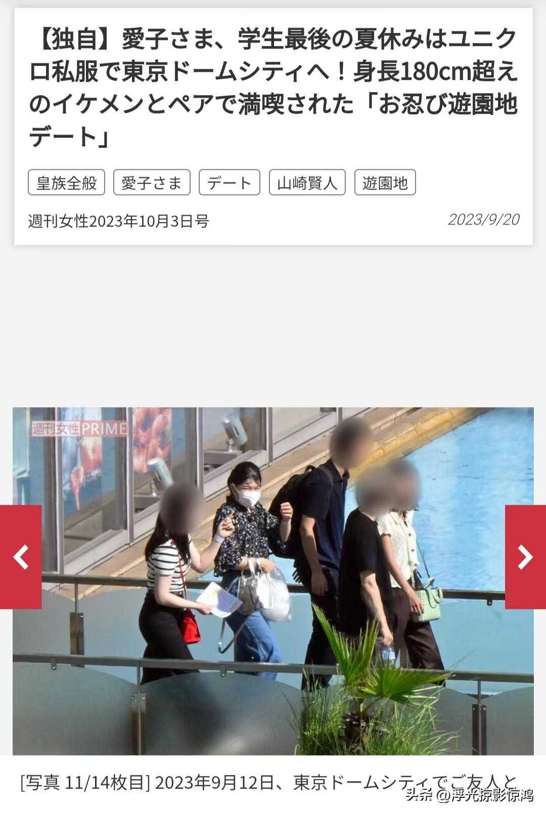日本皇室里的人气公主们,佳子近来没啥新动向,但是爱子公主却是拍到了走出皇宫,和一群朋友们出去玩。不过她的朋友们,也不全是女孩子,加上她自己,一共三男三女,六个人被十多个皇室安保紧紧地跟随着,去了东京的游乐园,来了一次愉快的玩耍。