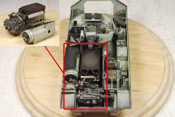 ▲从上面这张M2的模型图中就能清晰的看到M2的前部右侧发动机布置方式,发动机为二级涡轮增压V型8缸柴油机,缸径140毫米,冲程为121毫米