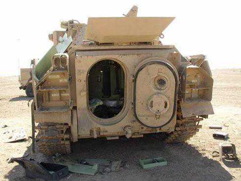 ▲从这辆被击毁的M2后部图可以看到整车最脆弱的后部舱门,该车采用的是一个向下的大跳门外加一个向右的小舱门的设计,这里就是武装分子最喜欢攻击的部位