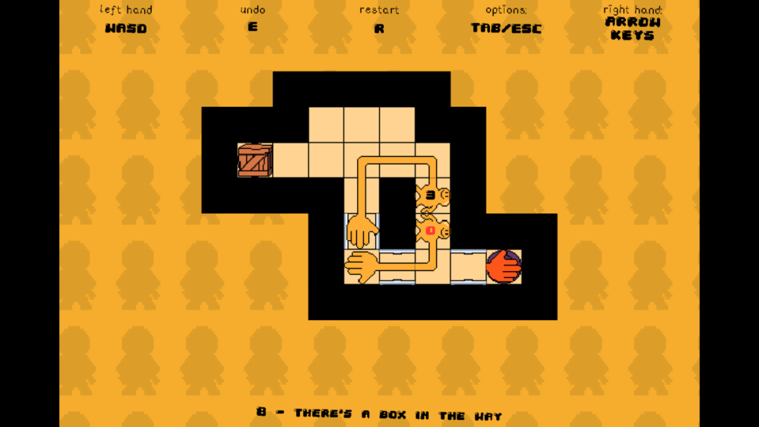 玩法上,游戏采用了推箱子的玩法,不过相比于传统的「小人推箱子」,玩家需要操控在场景两端的两只手,在规定的步数里伸长手臂,让它们汇合、握在一起。