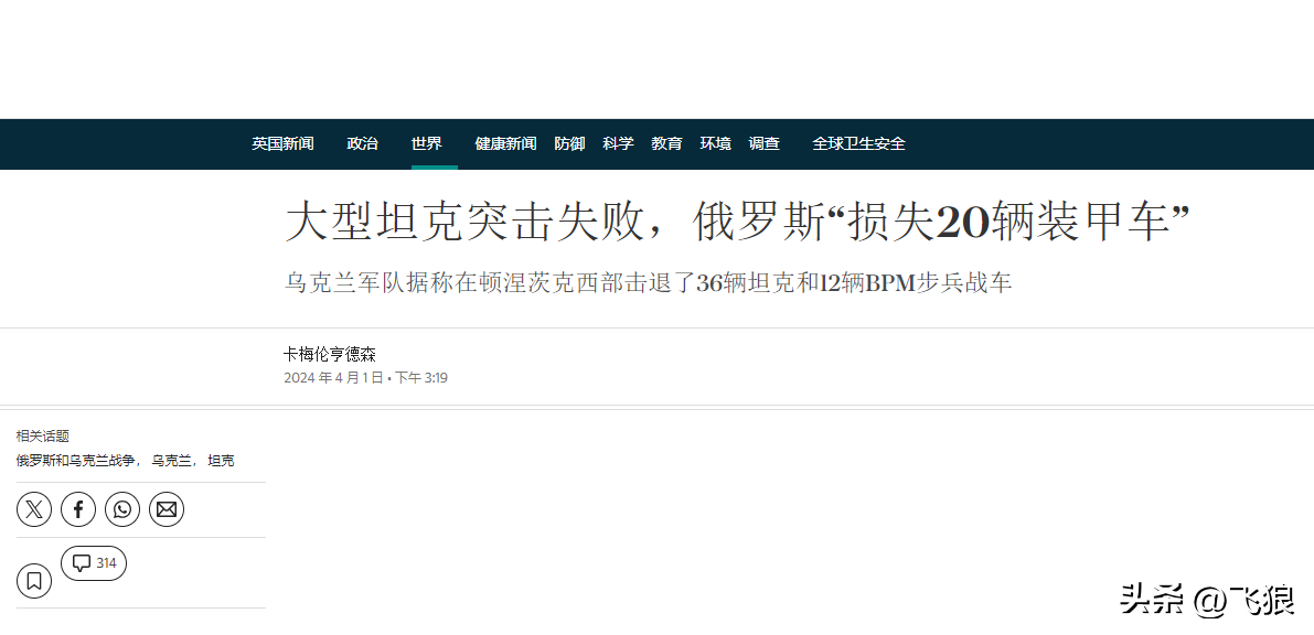 英国《电讯报》、美国《福布斯》4月1日披露了俄罗斯军队在顿涅茨克西部阿夫季夫卡发动的自俄乌战争以来最大规模的坦克突击战。