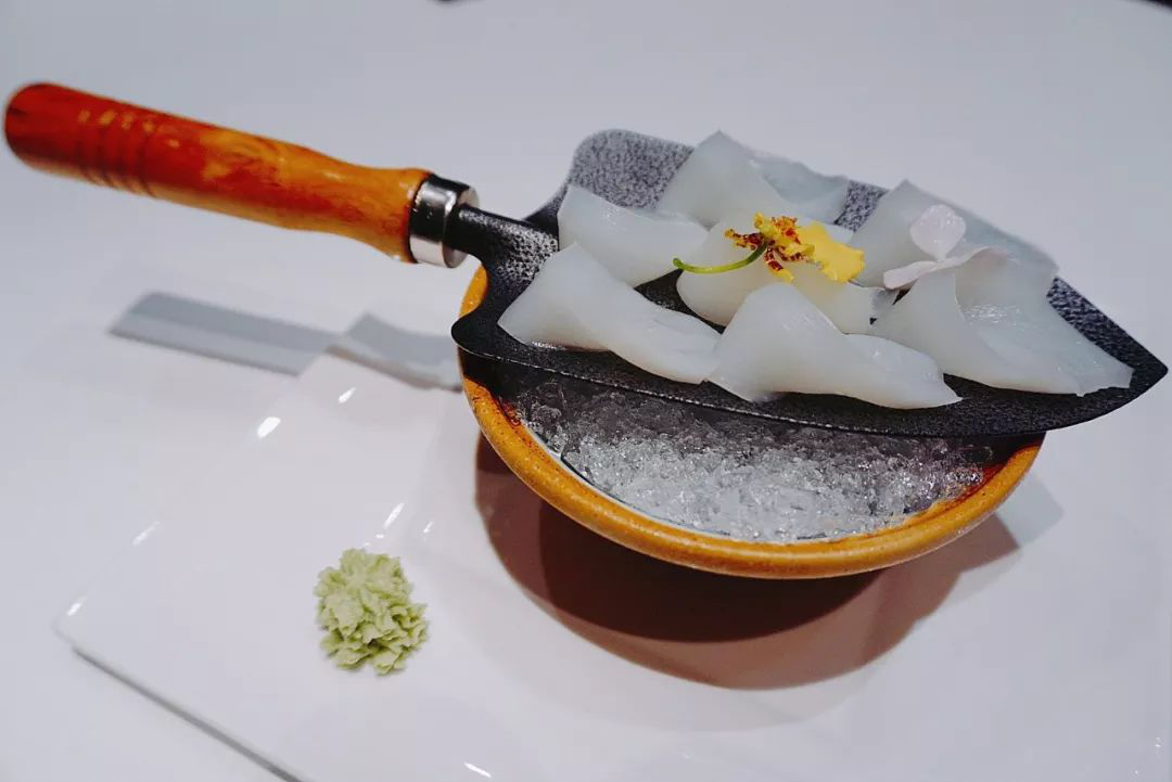 洁白如玉的墨鱼刺身,如花瓣般绽放,入口绵柔,用牙咬的瞬间又感觉非常滑韧,拌上手磨鲜芥末,充分体味这道来自海洋深处的美味。