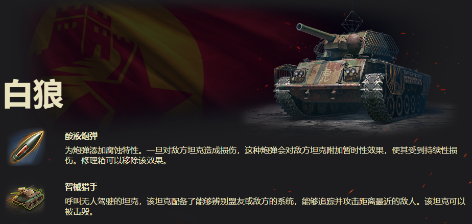 白狼和阿勒坎一样,都归属于轻型坦克,自身的输出能力较弱,但是技能的输出能力很强。