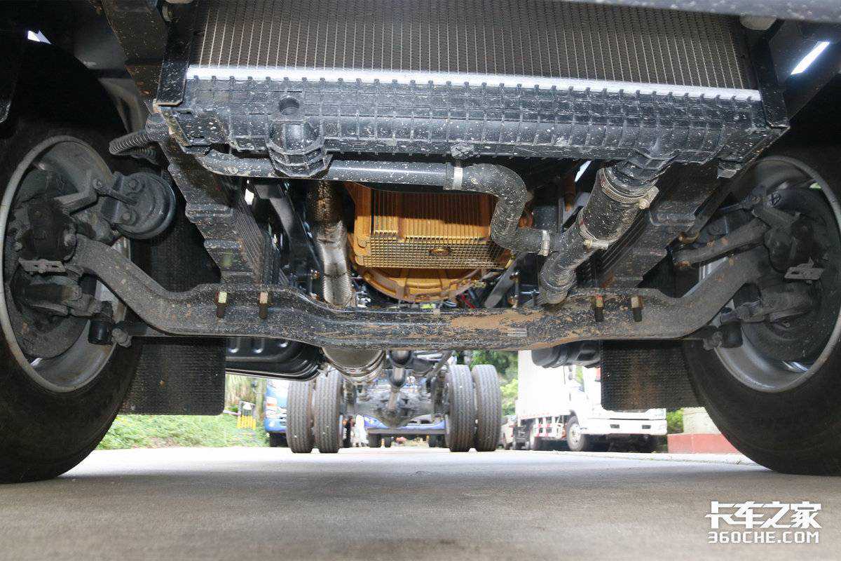 在底盘布局上,实拍车型采用3.6吨级前桥、8吨级后桥,其速比为4.33。该车悬架是采用前8后9+5结构钢板弹簧,还有280L容积油箱及规格为275/80的轮胎。有了以上车型数据,经计算该车型在经济转速1300-1600rpm时,车速可达75-91km/h。