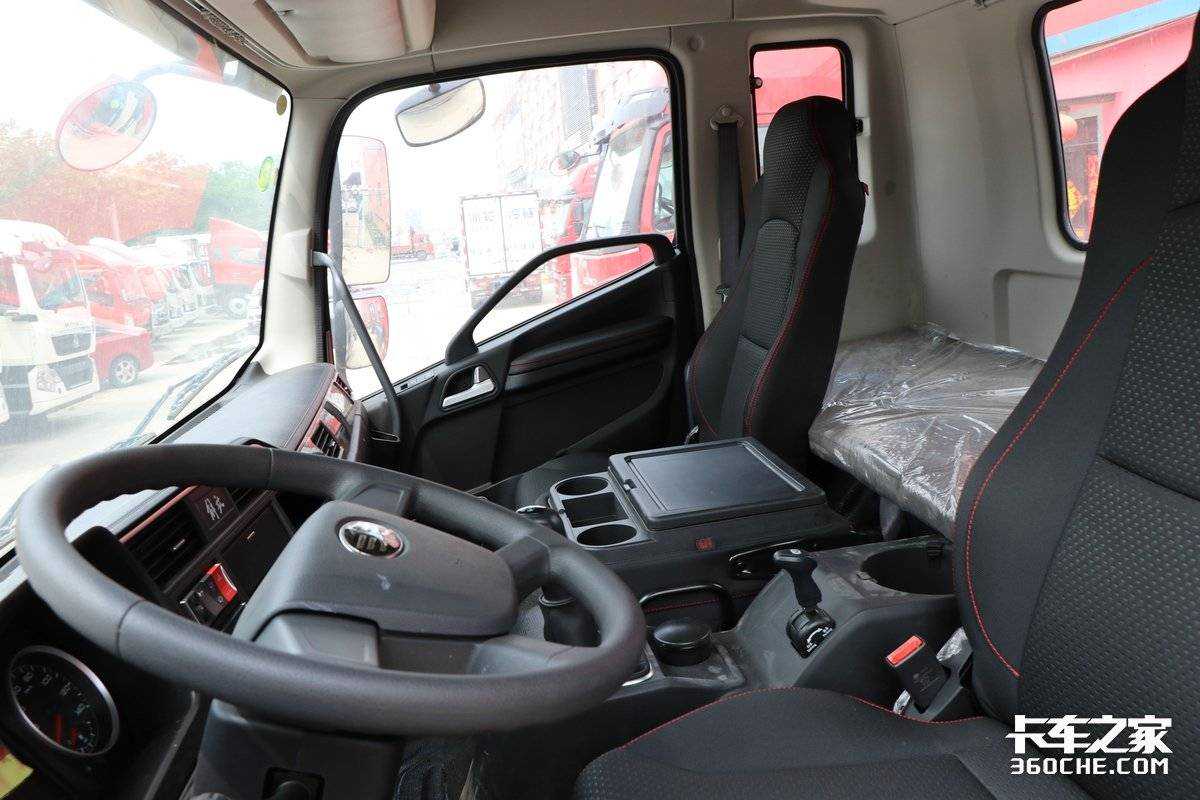我们再看驾驶室,实拍车型选用同级别中卡最宽驾驶室,其内部的宽度达到了2235mm。在配置方面,有带扶手的航空气囊减震座椅、四幅式多功能设计的方向盘,还有集成收音机、行车记录仪、电动空调及点烟器等功能的中控台。