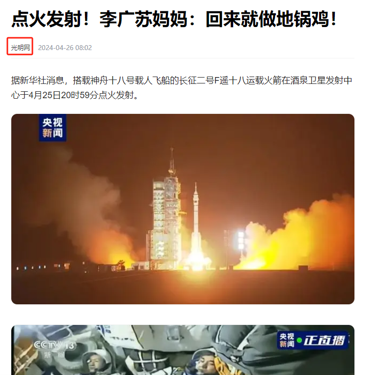 结语神州十八号已经发射成功,相信李广苏和他的队友们一定能在太空中圆满的完成任务。