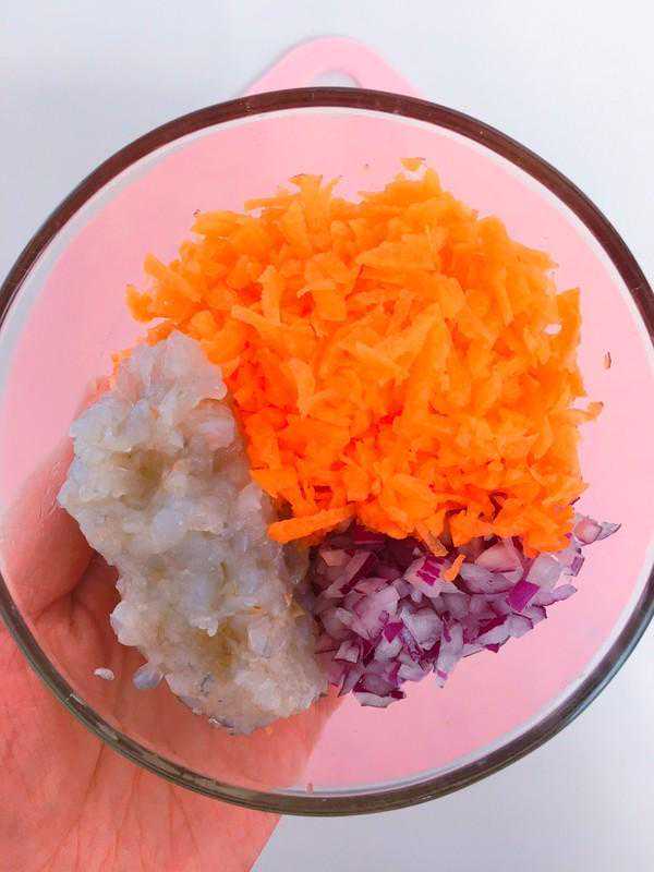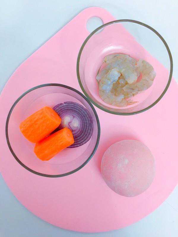粉色面团200克、胡萝卜1根、虾仁4-5只、洋葱少许、核桃油适量、酱爱上油适量