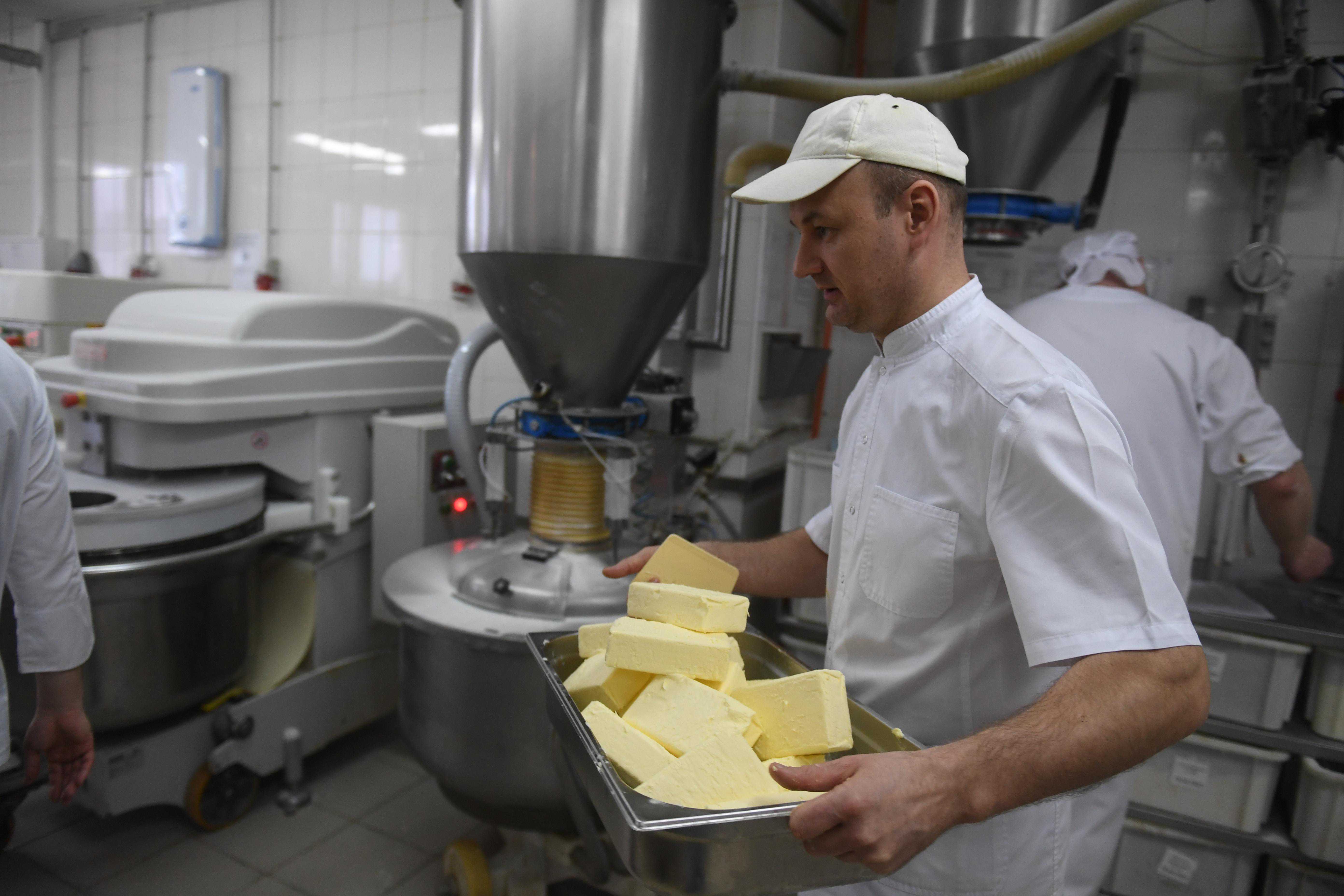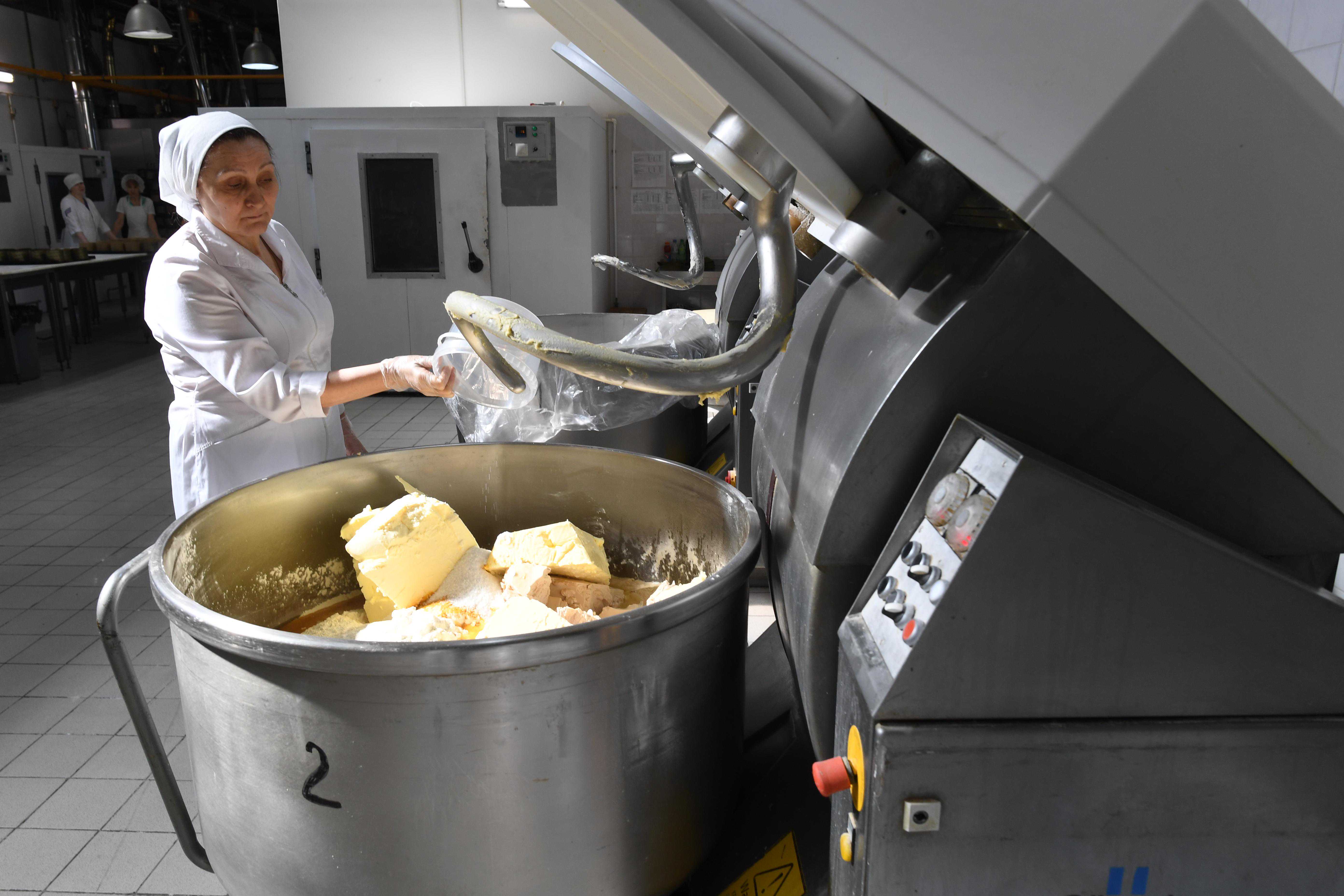 4月18日,在俄罗斯莫斯科的一家面包厂,工作人员搬运制作复活节蛋糕的黄油。新华社/卫星社