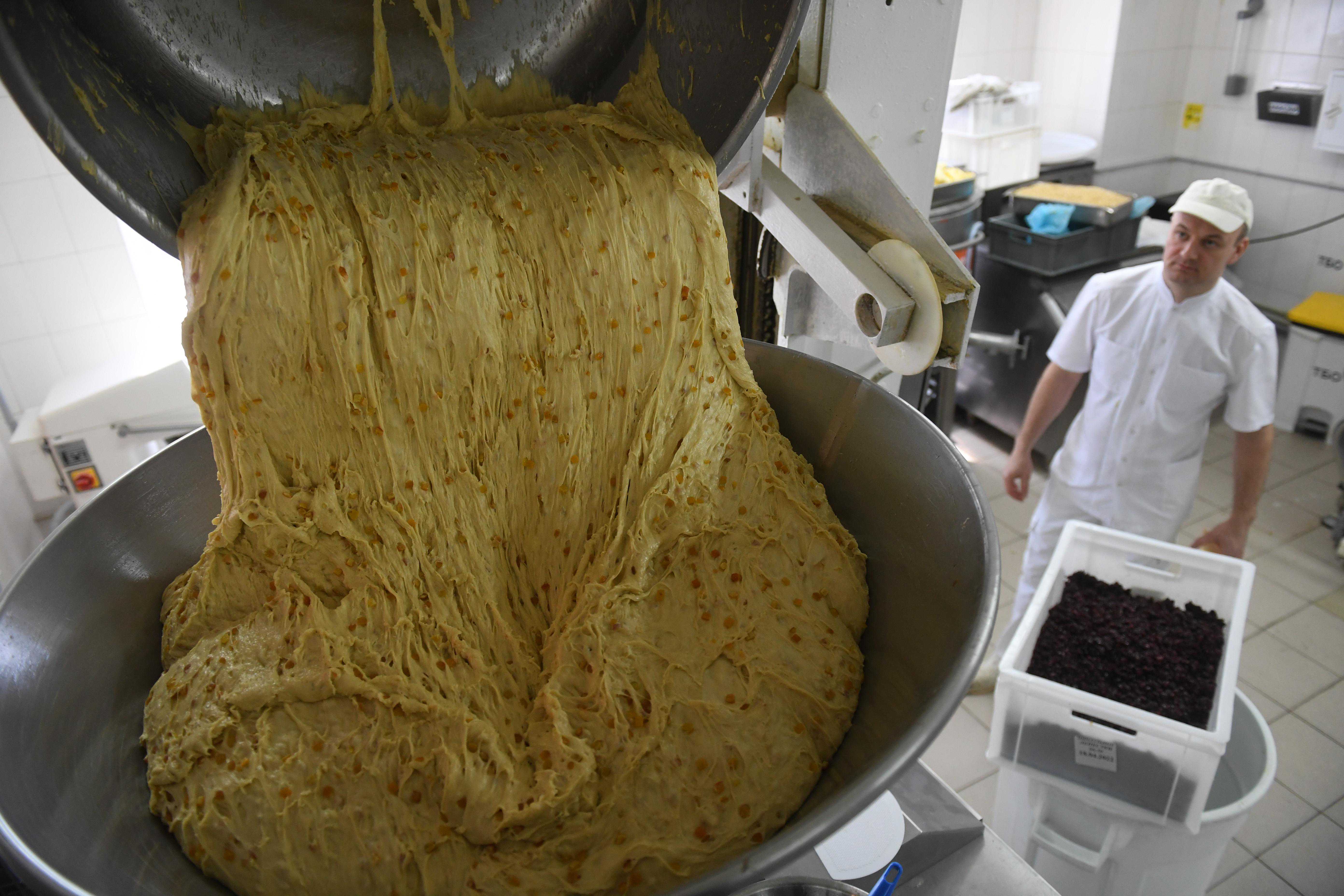 4月18日,在俄罗斯莫斯科的一家面包厂,工作人员制作复活节蛋糕面团。新华社/卫星社
